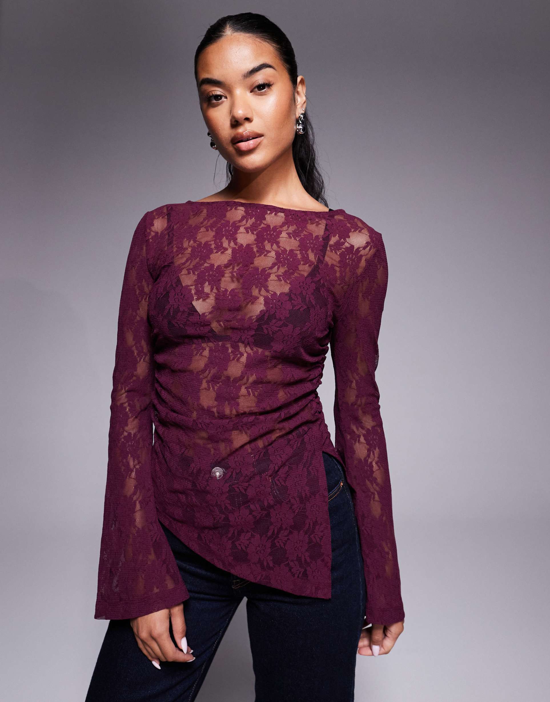 ASOS DESIGN LACE ANGEL SLEEVE TOP WITH GODET DETAIL IN FIG