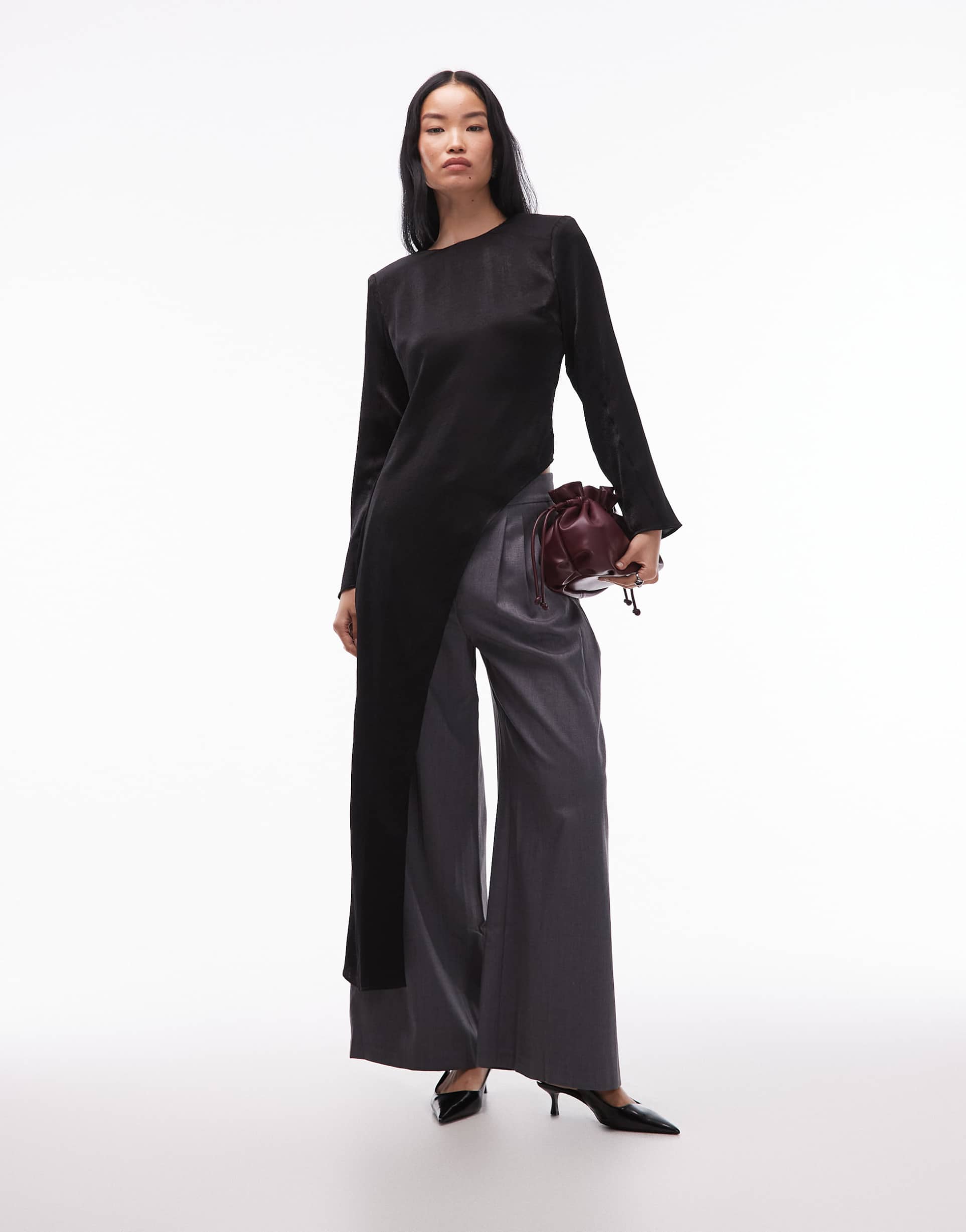A sleek and modern silhouette defines this ASOS DESIGN top featuring an asymmetric hem that adds a distinctive edge. Crafted from smooth polyester, it offers a regular fit complemented by long sleeves and a classic round neckline. The open back detail elevates its minimalist charm, making it a versatile choice for casual outings, workwear, or business casual settings. Its black solid hue ensures effortless pairing, while the pullover style provides ease of wear. This piece balances contemporary design with practical comfort, perfect for day-to-night transitions.