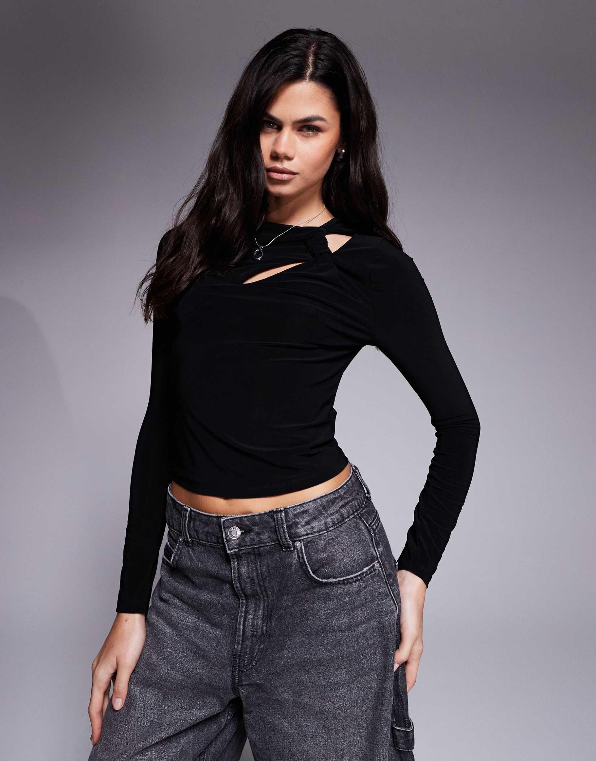 ASOS DESIGN LONG SLEEVE TOP WITH TWIST CUT OUT DETAIL IN BLACK