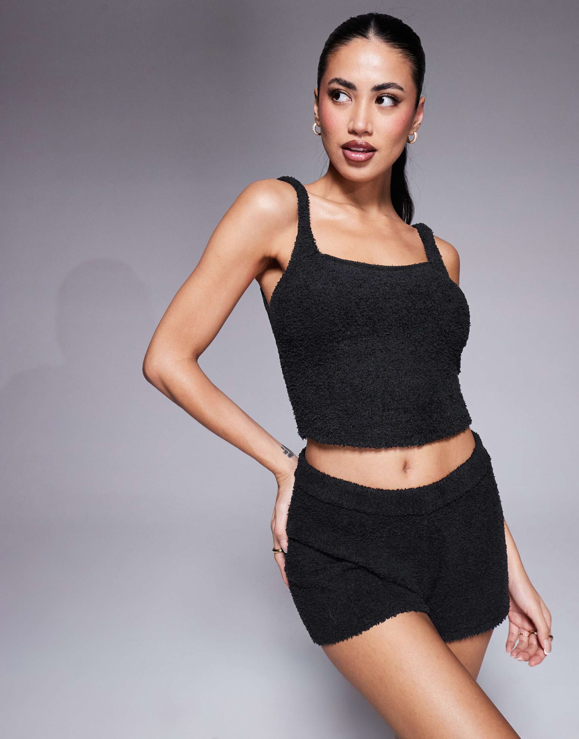 Soft and cozy with a fluffy knit texture, this black cropped tank top features a minimalist square neckline and fixed wide straps for a comfortable regular fit. Crafted from polyester, it offers easy slip-on convenience and a casual chic vibe perfect for loungewear, casual outings, or everyday wear. The simple solid design ensures versatility, making it an essential piece for relaxed and stylish layering.