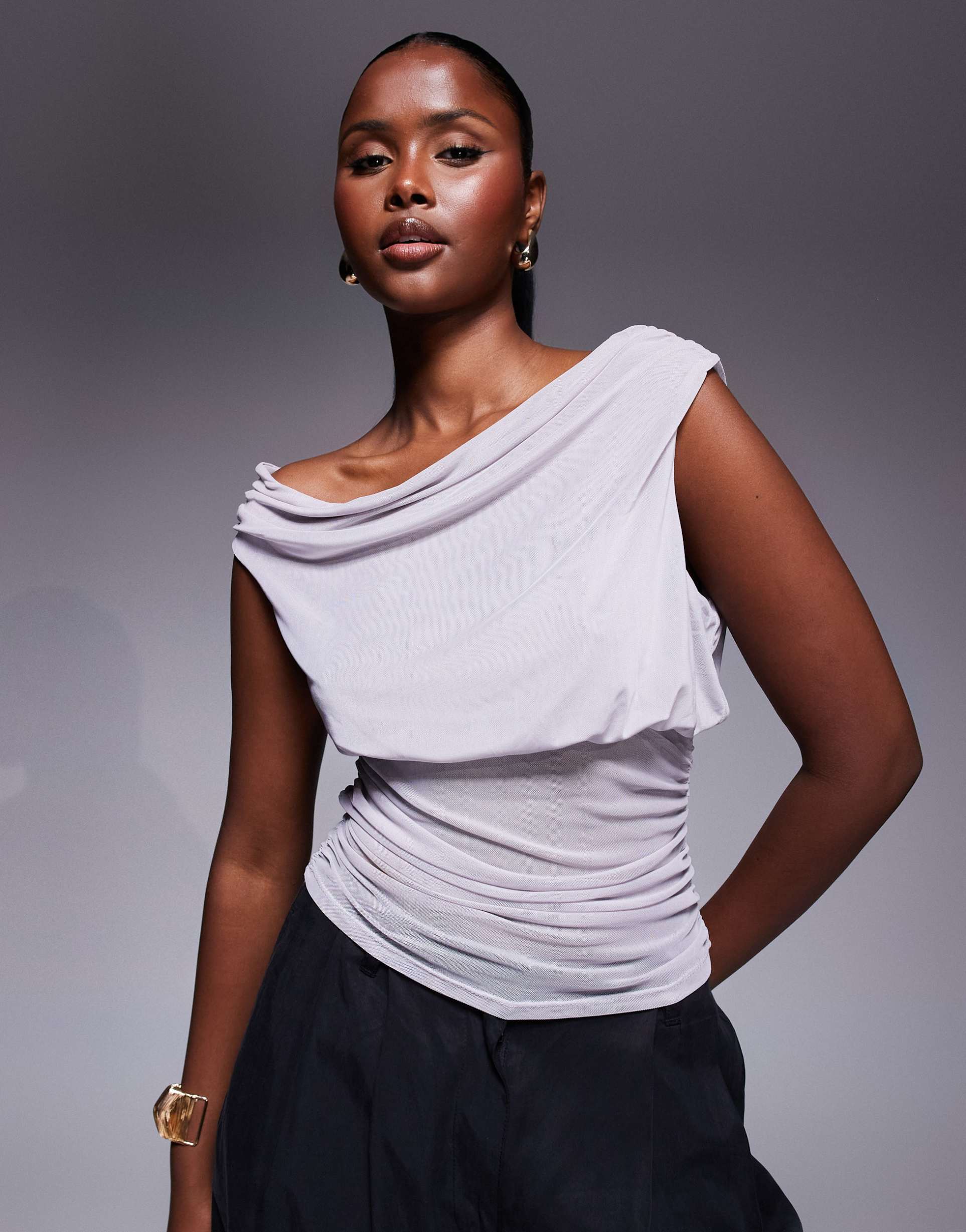 Soft mesh fabric with a subtle sheer effect and a flattering cowl neck shape define this sleeveless shell top. Its regular fit and ruched sides with a cinch waist create a comfortable yet stylish silhouette that sits at waist length. Designed for spring through autumn wear, this modern chic top pairs effortlessly for casual outings, brunches, and night outs, offering both breathability and a sophisticated edge.