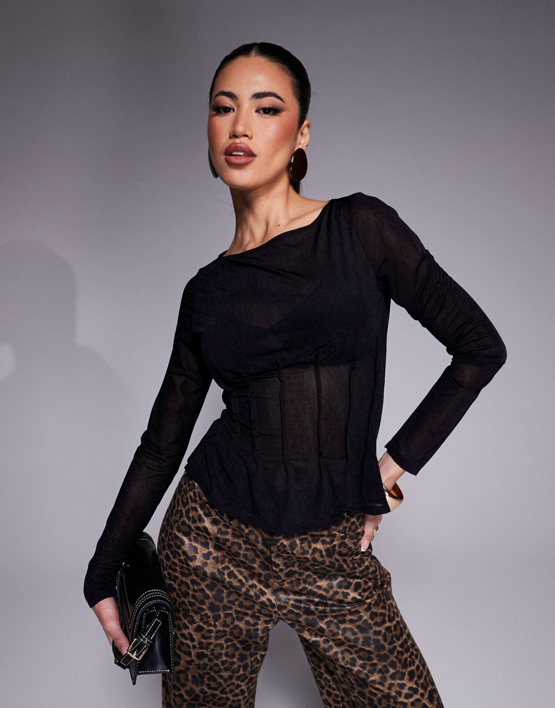 ASOS DESIGN MESH DART DETAIL LONG SLEEVE TOP IN BLACK
