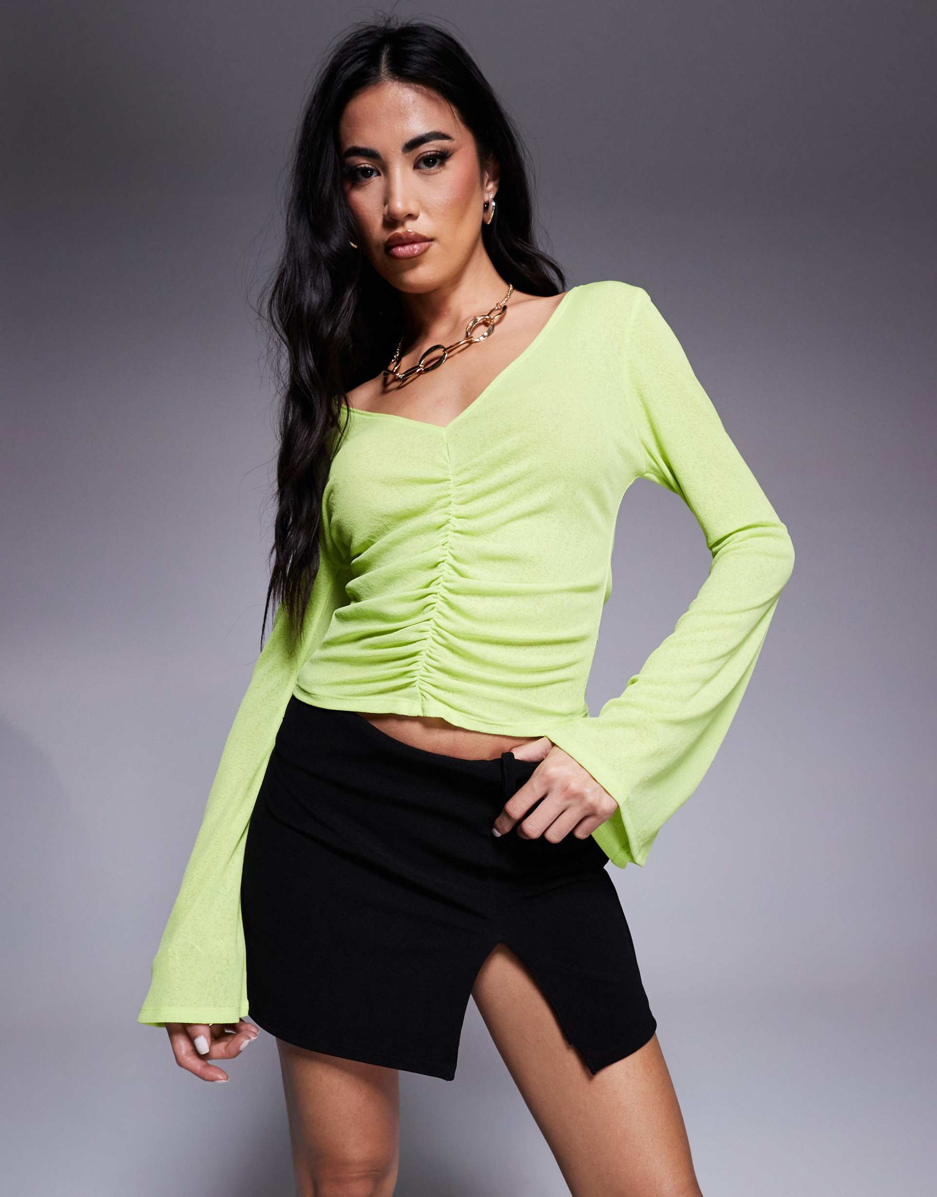 Bright lime hues and sheer mesh fabric combine with a modern plunge neck and ruched front details to create a trendy, waist-length top. The long, flared sleeves add a dramatic, stylish touch while the regular fit ensures comfort and versatility. Ideal for casual days, brunch dates, or night outs, this lightweight polyester piece delivers both a sexy and contemporary vibe with subtle texture and figure-enhancing ruching.