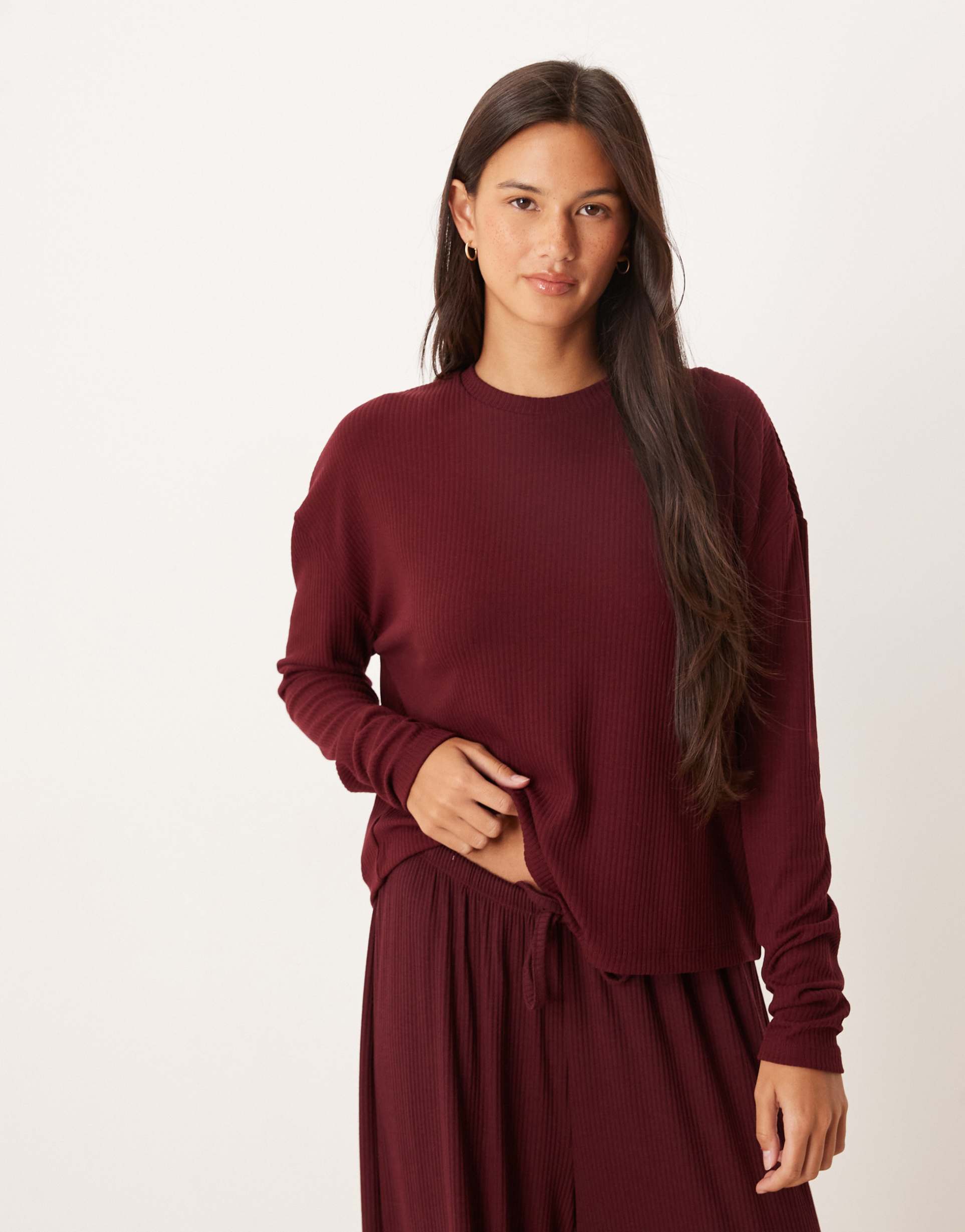 ASOS DESIGN MIX & MATCH RIBBED AND VELVET TRIM LONG SLEEVE TOP IN BURGUNDY
