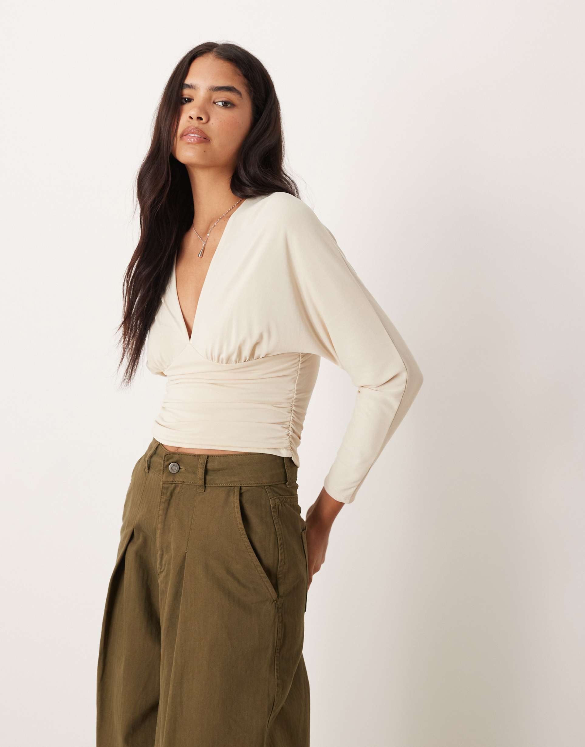 ASOS DESIGN MODAL LONG SLEEVE TOP WITH CINCH PANEL IN COCONUT MILK