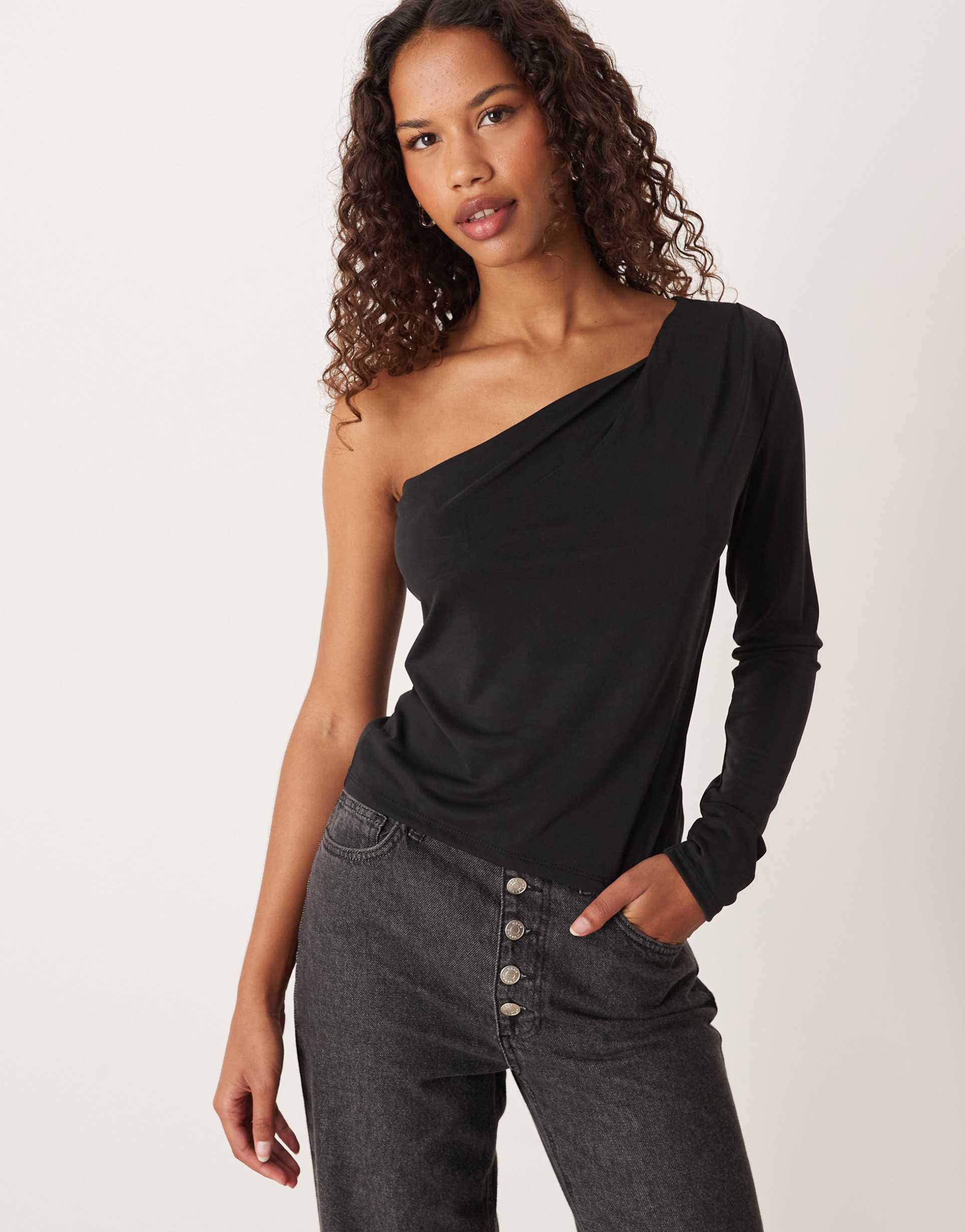 ASOS DESIGN MODAL TWISTED SHOULDER LONG SLEEVE TOP IN BLACK