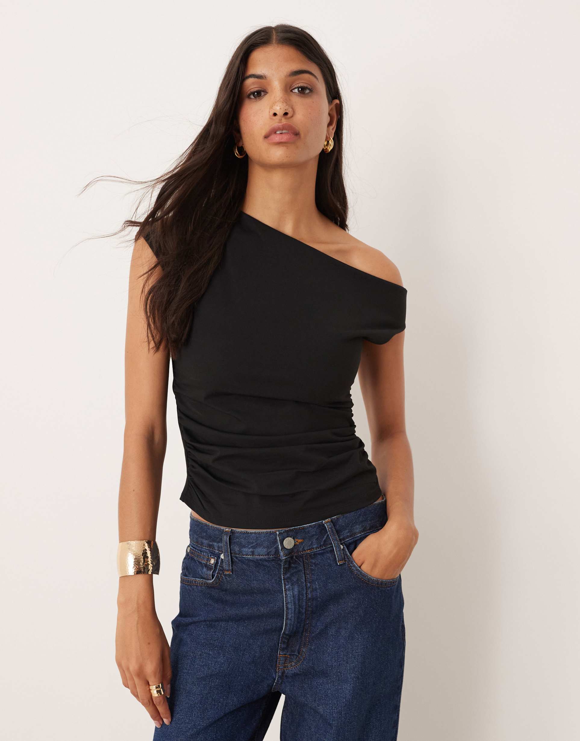 ASOS DESIGN OFF SHOULDER RUCHED DETAIL TOP IN BLACK
