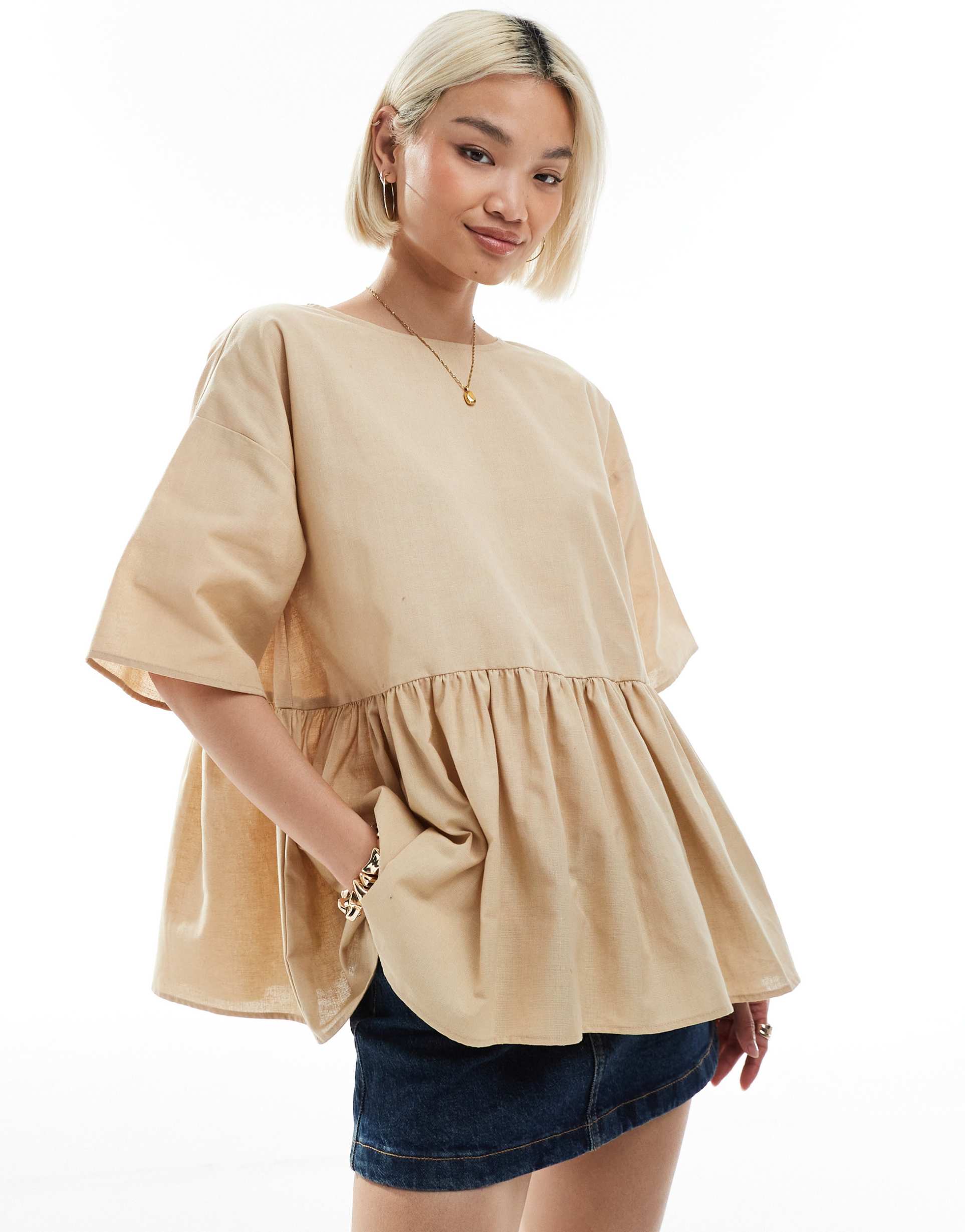 ASOS DESIGN OVERSIZED PEPLUM SHORT SLEEVE SMOCK IN LINEN-BLEND IN STONE