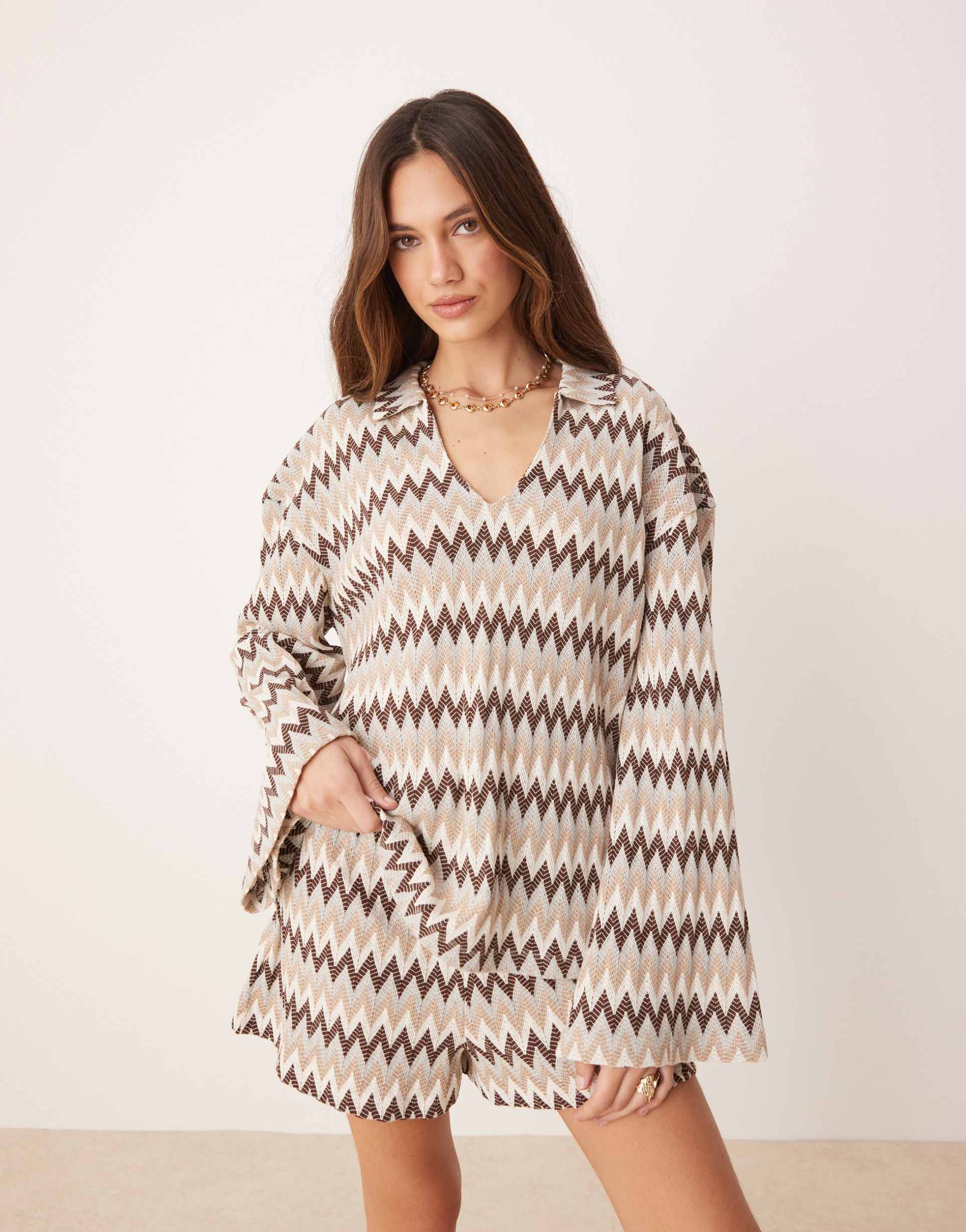 ASOS DESIGN OVERSIZED RUGBY COLLAR TOP IN BROWN CHEVRON STRIPE - PART OF A SET