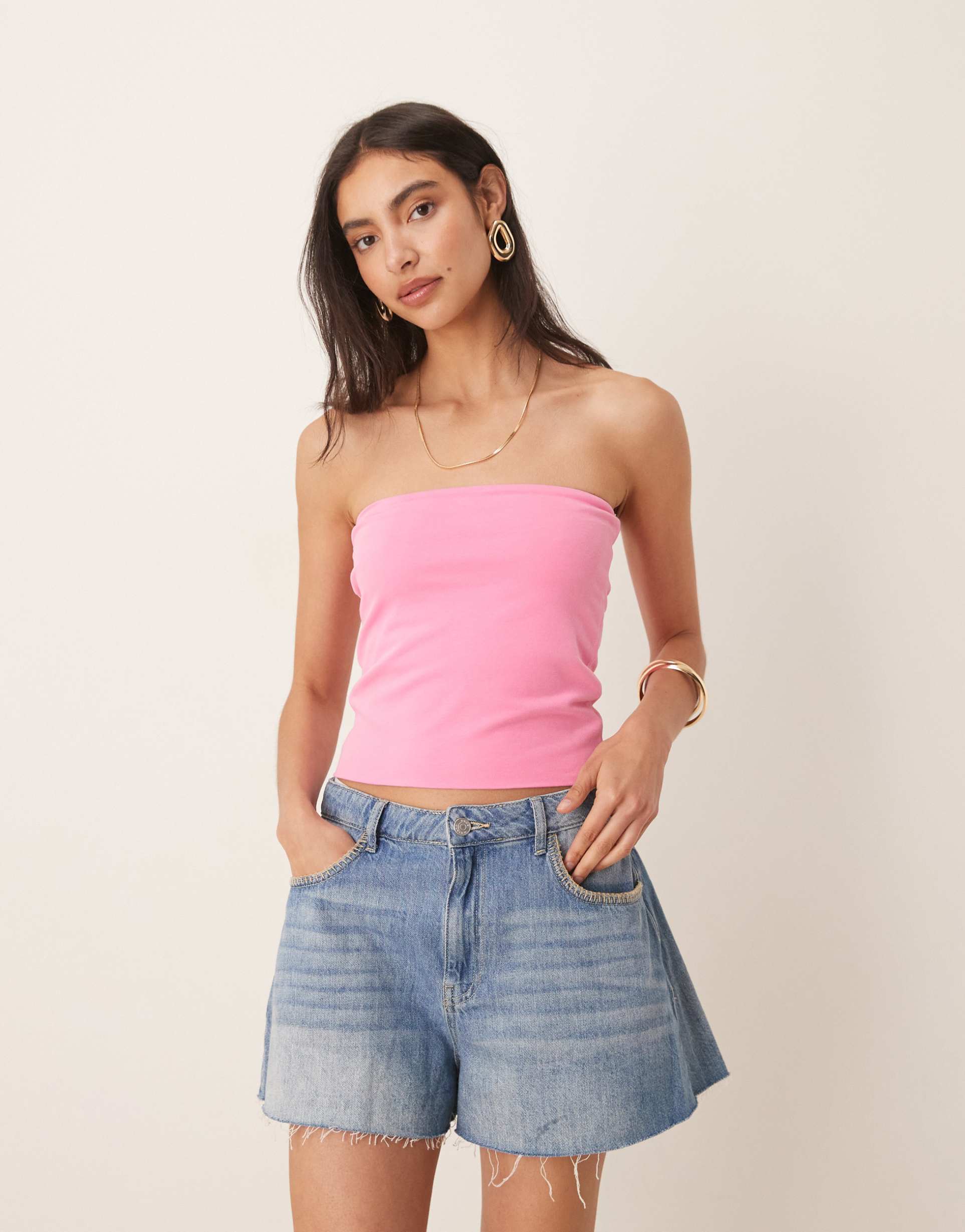 ASOS DESIGN PEACHED COTTON LONG LINE BANDEAU TOP IN PINK