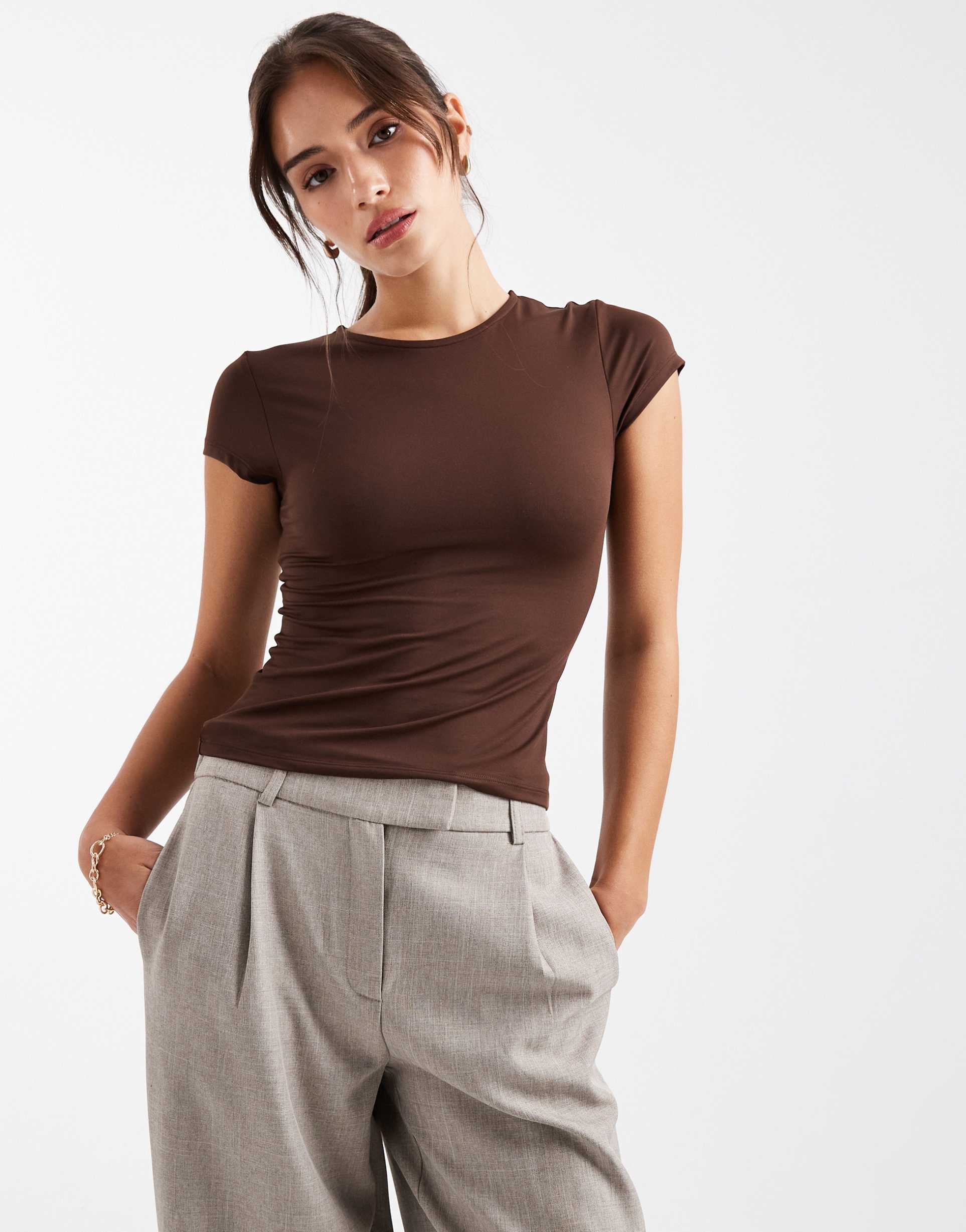 ASOS DESIGN POLYAMIDE SLINKY EVERYDAY SHORT SLEEVE TOP IN CHOCOLATE