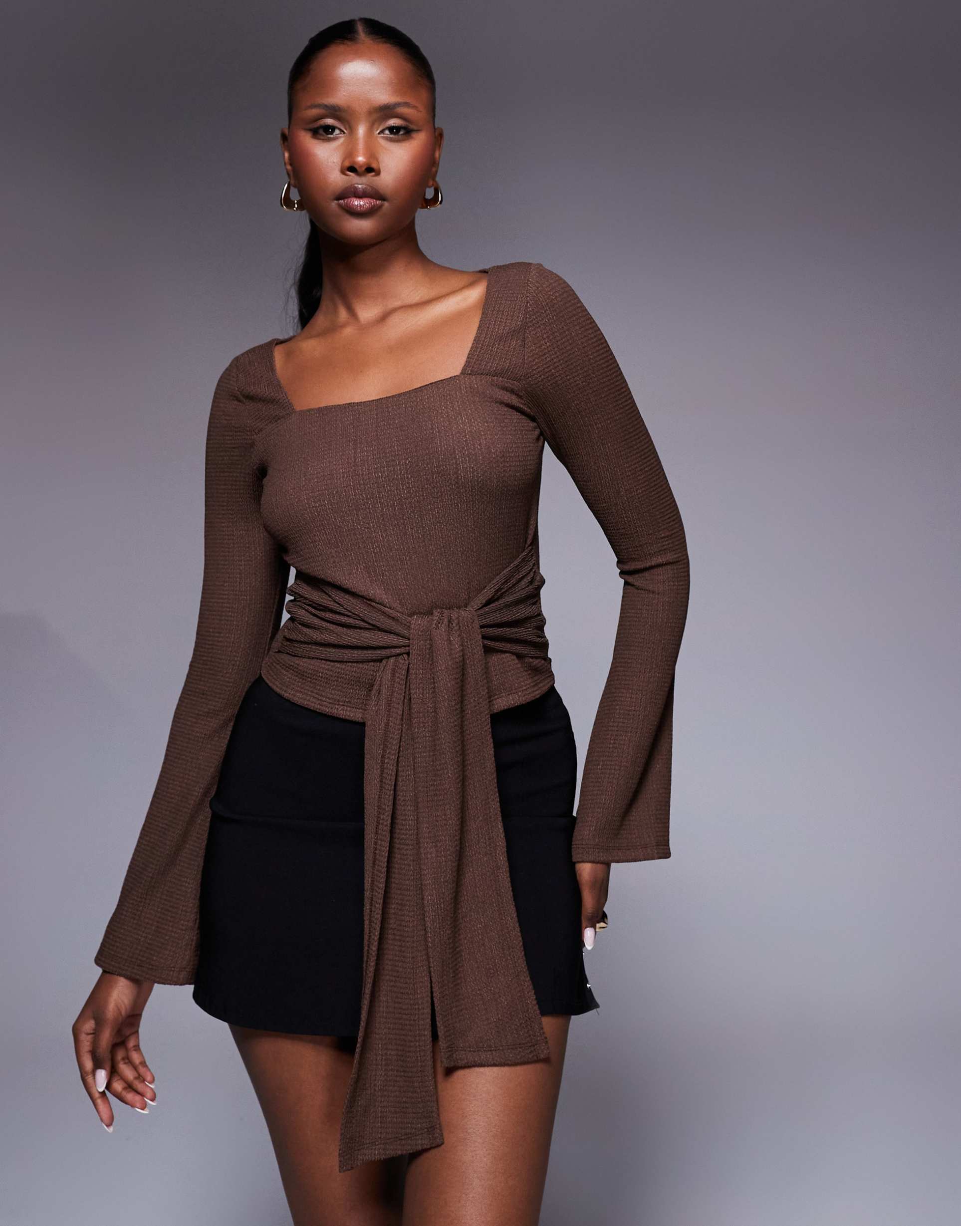 Soft and stretchy polyamide fabric shapes this sleek, slim fit top featuring a modern square neckline and long regular sleeves. The waist-tie knot detail adds an elegant touch to the waist-length silhouette, perfect for layering or wearing solo. Its matte brown hue brings warmth suitable for autumn, winter, or spring wear, making it a versatile piece for casual outings, date nights, or stylish evening events. Combining comfort and chic appeal, it seamlessly transitions from day to night with a sophisticated edge.