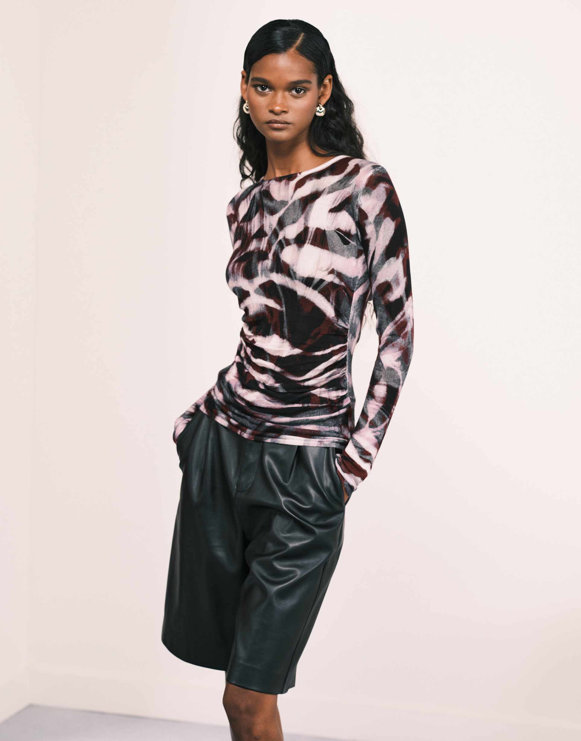 Soft-touch viscose knit meets a slim fit in this ASOS DESIGN shell top, featuring a bold all-over abstract print in black and light pink. The long sleeves and classic crew neck offer a timeless silhouette, while the ruched side detail adds a modern textural twist. Hip length and stretchy fabric ensure comfortable wear for autumn through spring. Versatile for casual days, streetwear vibes, or business casual settings, this chic top balances style and comfort effortlessly.