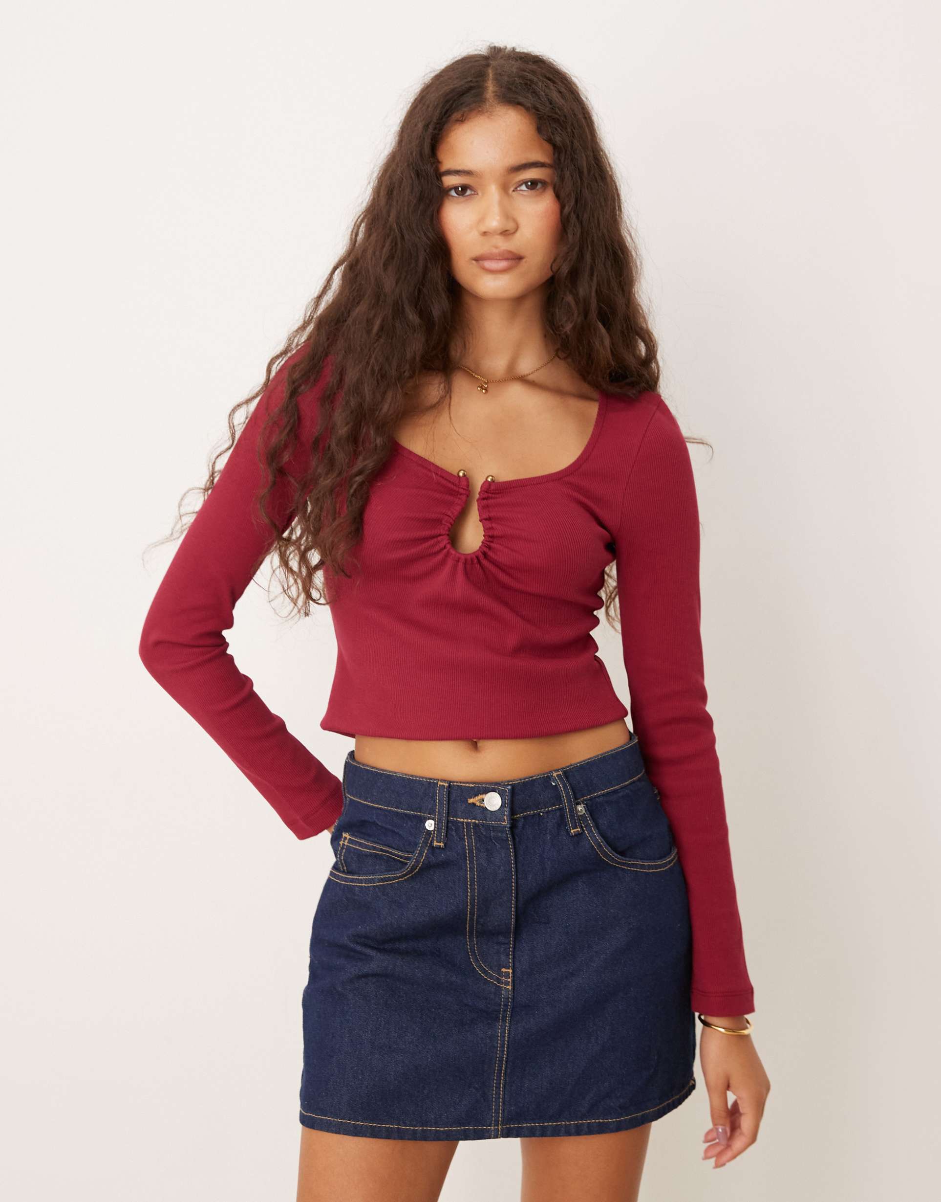 This rib knit cropped top in a matte burgundy hue combines a slim fit with long sleeves and a scoop neck for a flattering silhouette. Featuring a distinctive u-wire keyhole front with metallic gold hardware, it adds a trendy and casual chic vibe. Crafted from soft, stretchy cotton rib knit fabric with elastane, it ensures comfort and flexibility. Ideal for casual outings, brunch dates, or nights out, this versatile top blends style and ease effortlessly.