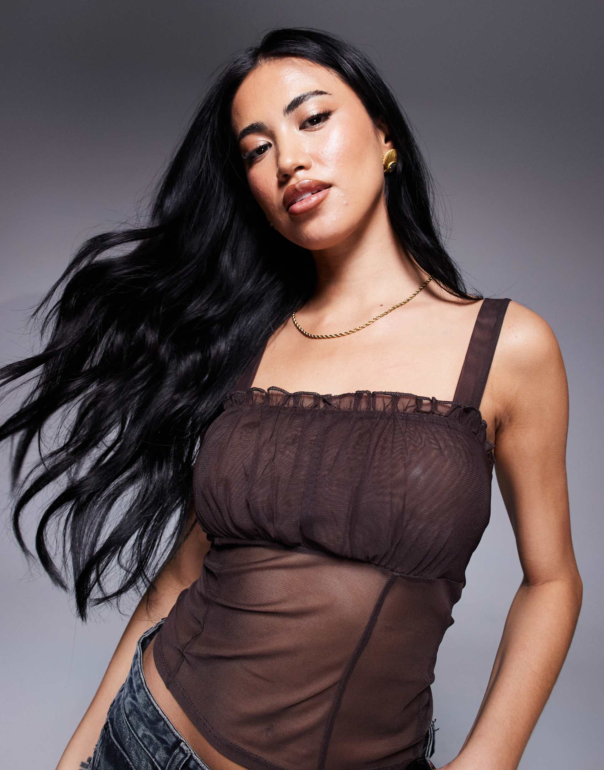 ASOS DESIGN RUCHED MESH TOP WITH SEAM DETAILS IN CHOCOLATE