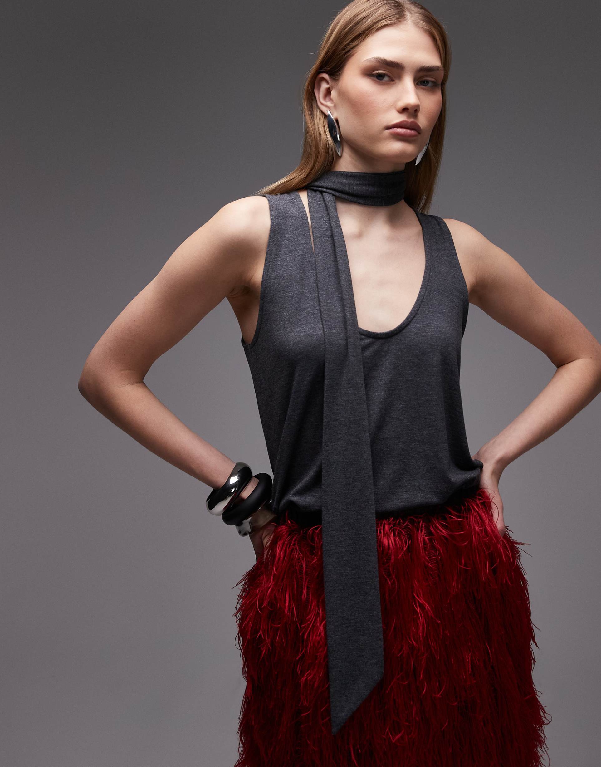 ASOS DESIGN SCARF DETAIL SCOOP NECK TANK TOP IN CHARCOAL