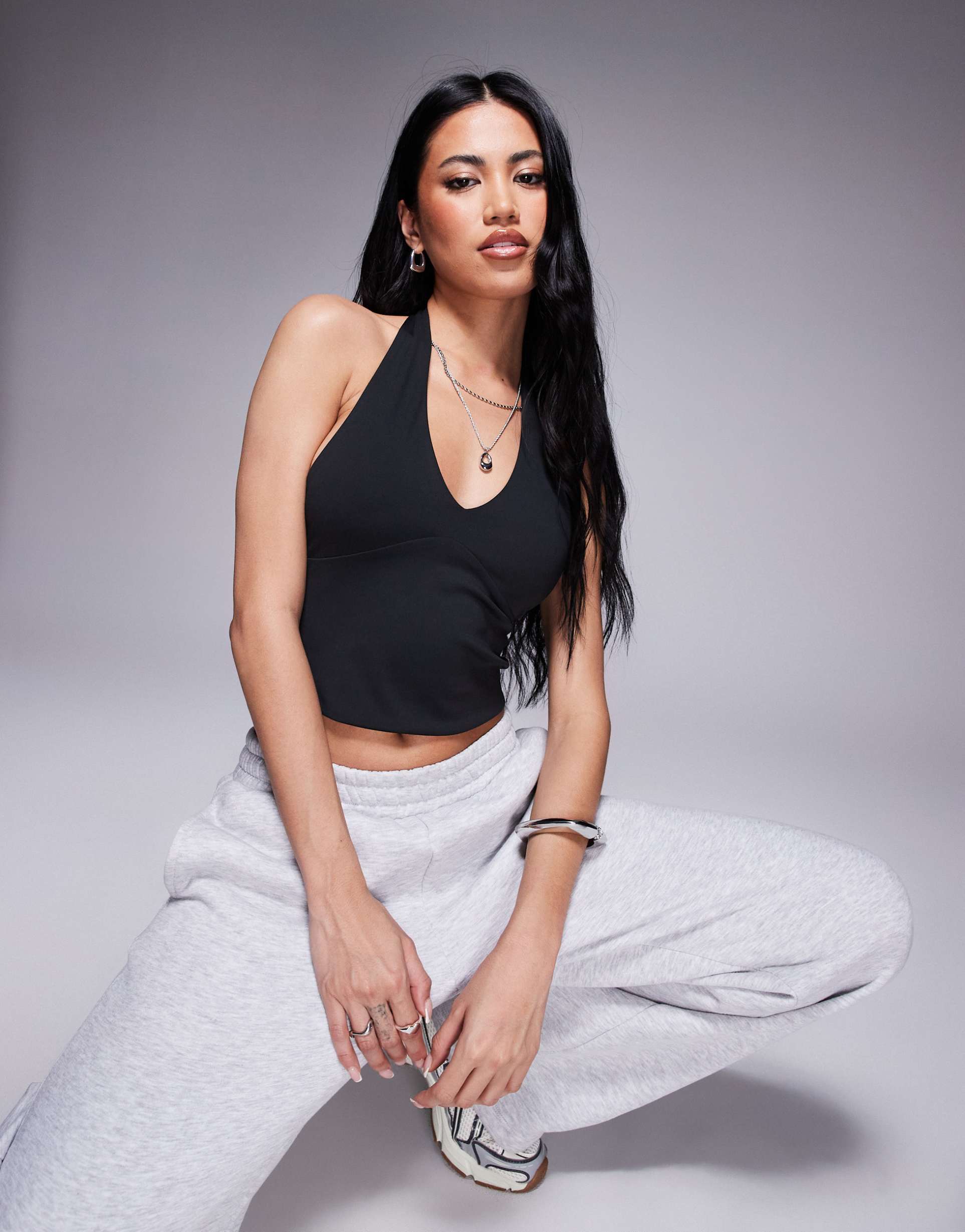 Soft and stretchy black jersey fabric sculpts a slim fit halter neck top with an open back and cropped length. This sleeveless pullover piece embodies minimalist and sporty chic styles perfect for warm summer days. Its versatile silhouette suits casual outings, brunch dates, and night out events, combining comfort with a sleek, modern edge. The halter neckline and open back create a flattering, stylish look that pairs effortlessly with high-waisted bottoms for a contemporary ensemble.