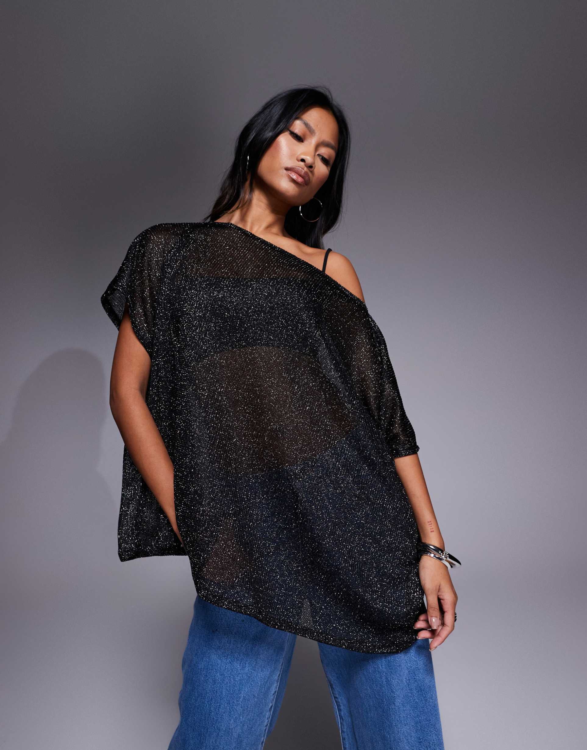 ASOS DESIGN SHEER METALLIC OVERSIZED SLOUCHY OFF SHOULDER CAPE TOP IN BLACK