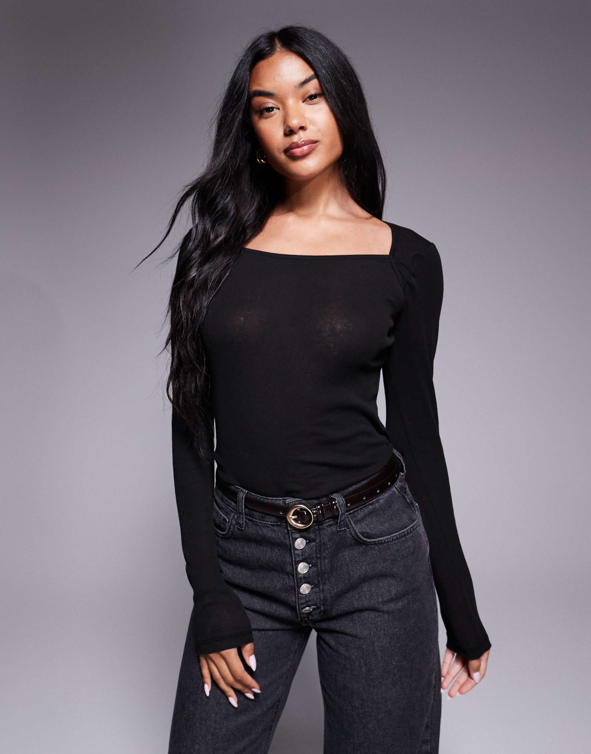 A sleek matte black shell top crafted from soft, stretchy cotton knit fabric offers a regular fit with long, regular sleeves and a distinctive square neckline. The hip-length silhouette is enhanced by subtle sheer panels, adding a modern minimalist touch. This versatile piece suits casual outings, everyday wear, and workwear, making it a staple for transitional seasons like autumn, winter, and spring. Its pullover style and classic design ensure effortless styling for a refined yet comfortable look.