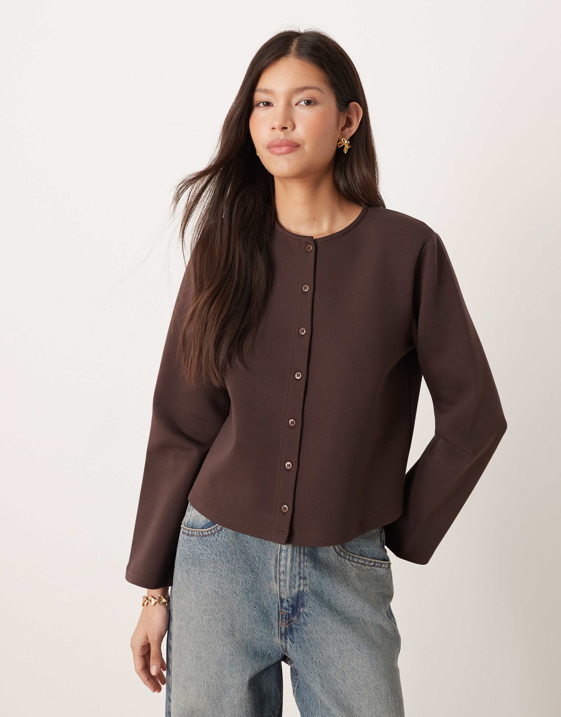 Soft and stretchy interlock fabric shapes this ASOS DESIGN boxy top in a rich matte brown hue. Featuring a classic crew neck and long regular sleeves, its hip-length silhouette is enhanced by padded shoulders that add structured appeal. The front button placket complements the minimalist design, making it a versatile choice for casual days, workwear, or everyday styling. Combining comfort with a timeless look, this top effortlessly blends style and ease for multiple occasions.