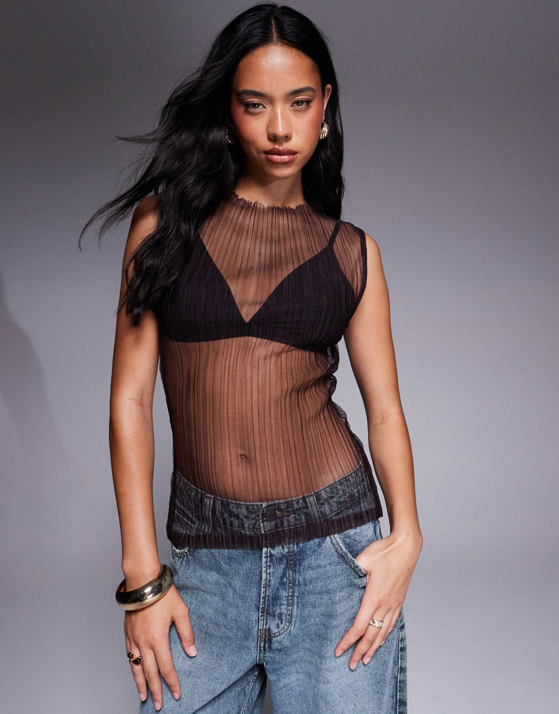 ASOS DESIGN SLEEVELESS HIGH NECK SHEER PLISSE TOP IN BROWN