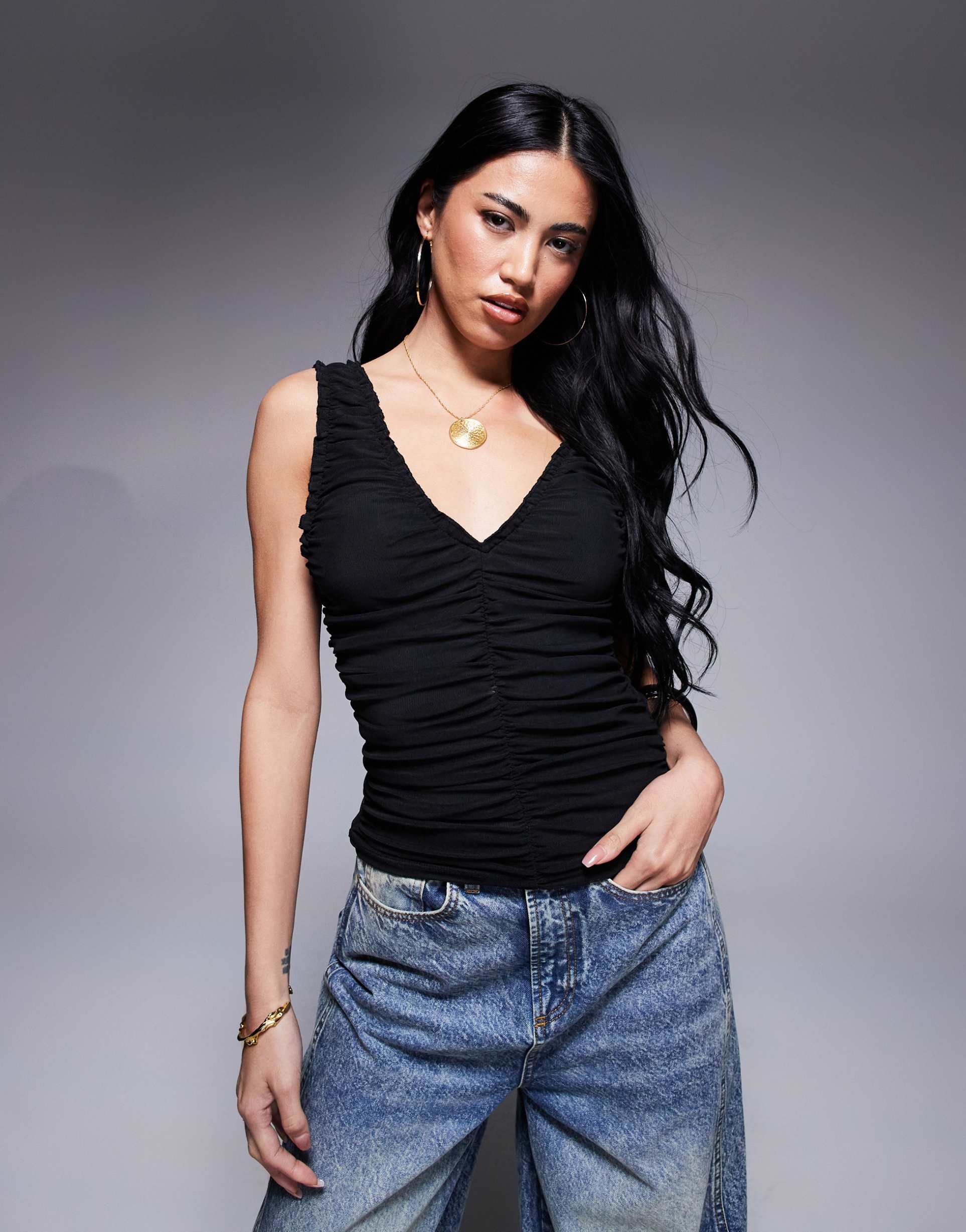 ASOS DESIGN SLEEVELESS MESH TOP WITH RUCHING DETAILS IN BLACK