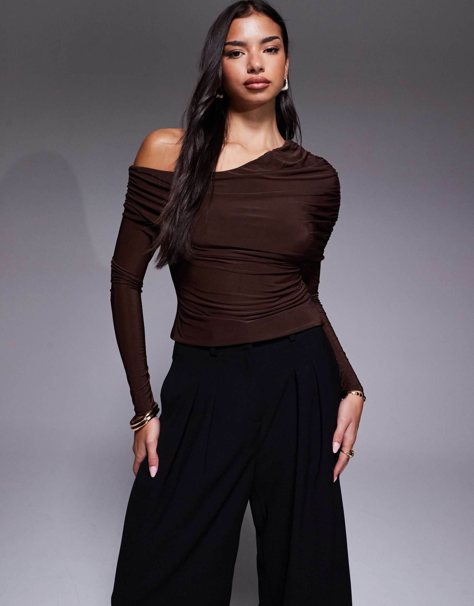 ASOS DESIGN SLINKY ASYMMETRIC CAPE SHOULDER LONG SLEEVE TOP IN CHOCOLATE