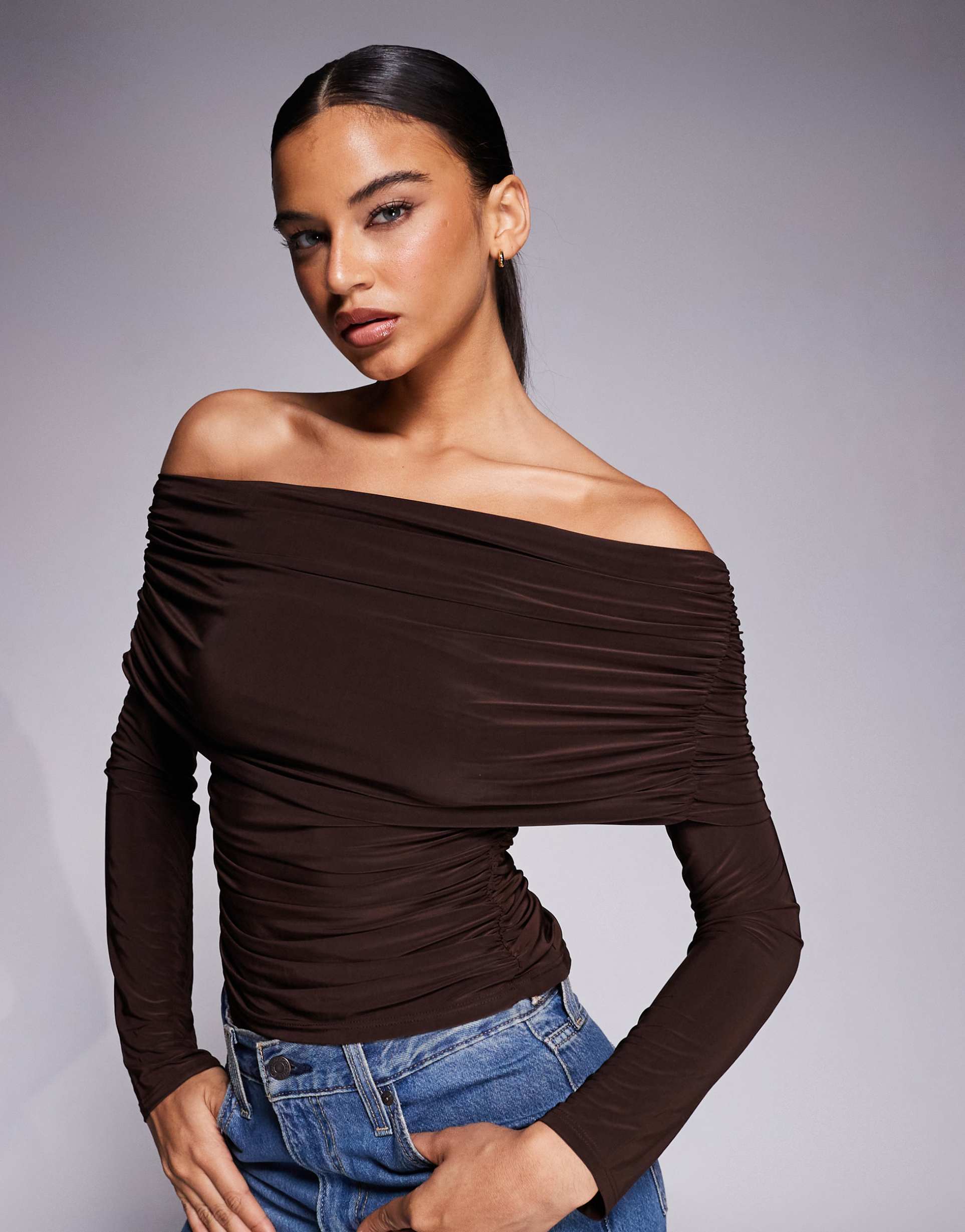 ASOS DESIGN SLINKY DRAPE BARDOT LONG SLEEVE TOP IN CHOCOLATE