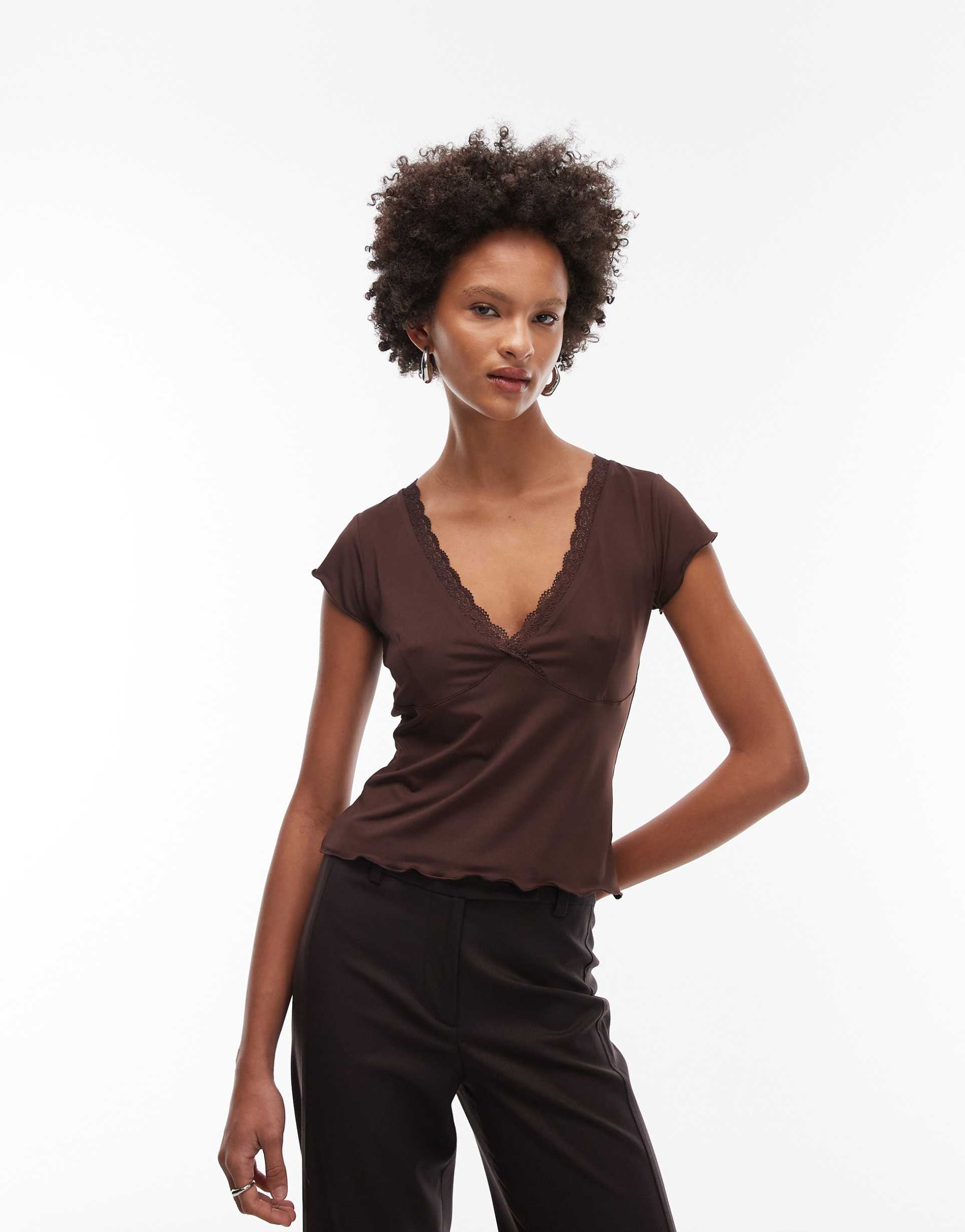 ASOS DESIGN SLINKY LACE TRIM V-NECK TOP IN BROWN