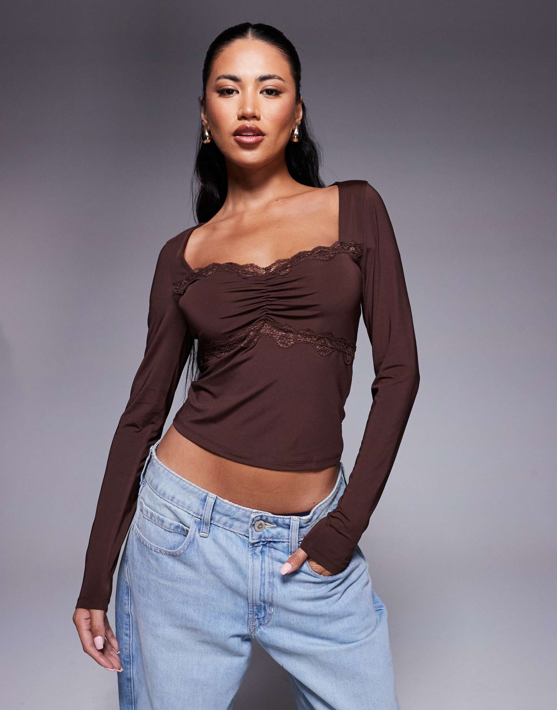 Glossy, stretchy jersey fabric and a slim fit define this ASOS DESIGN long sleeve top featuring a flattering sweetheart neck and ruched front detailing. The waist length silhouette with lace trim on the front adds a chic and sexy vibe, making it ideal for casual outings, night outs, or date nights. Its matte chocolate brown hue complements versatile styling options, while the pullover closure and regular long sleeves ensure comfort and ease. This modern top blends texture and sleek design for a confident, contemporary look.