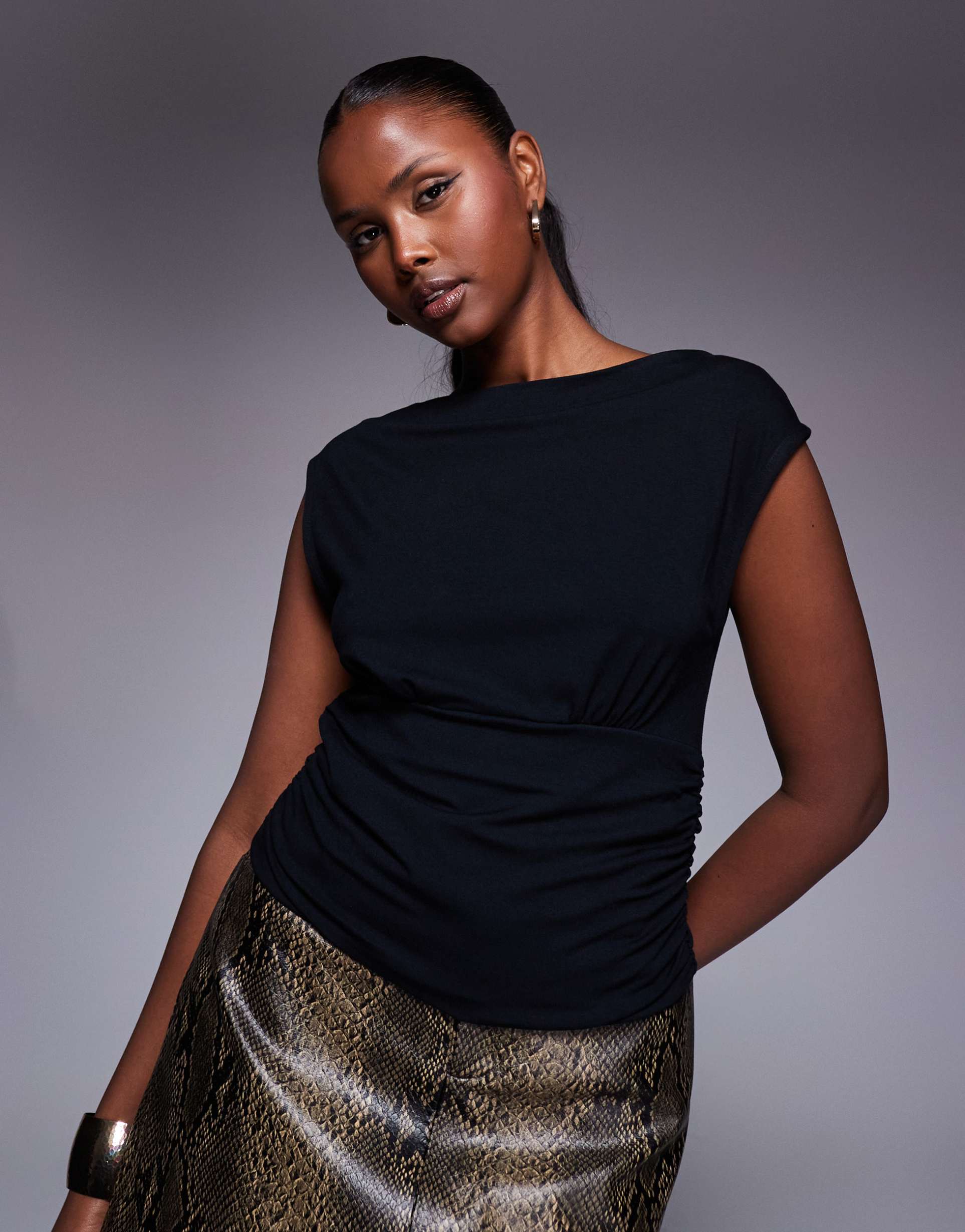 ASOS DESIGN SLINKY WIDE SHOULDERS CINCHED WAIST TOP IN BLACK