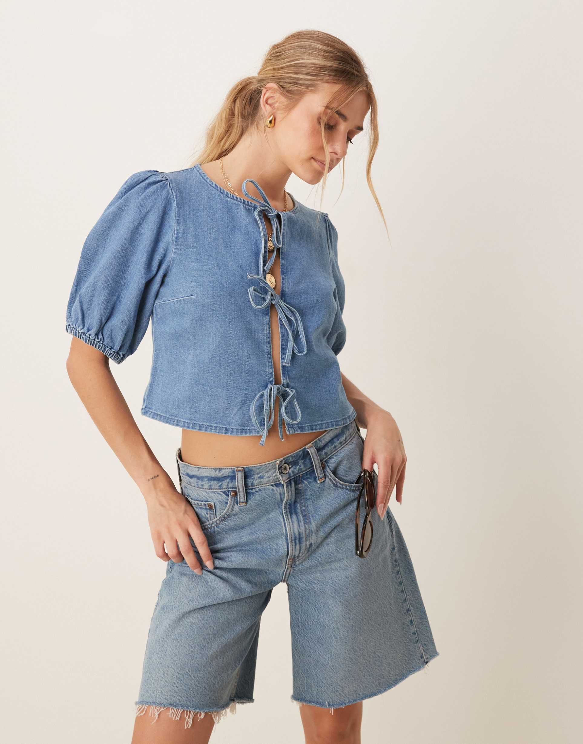 ASOS DESIGN SOFT DENIM TOP WITH TIE FRONT DETAIL IN MID-WASH BLUE