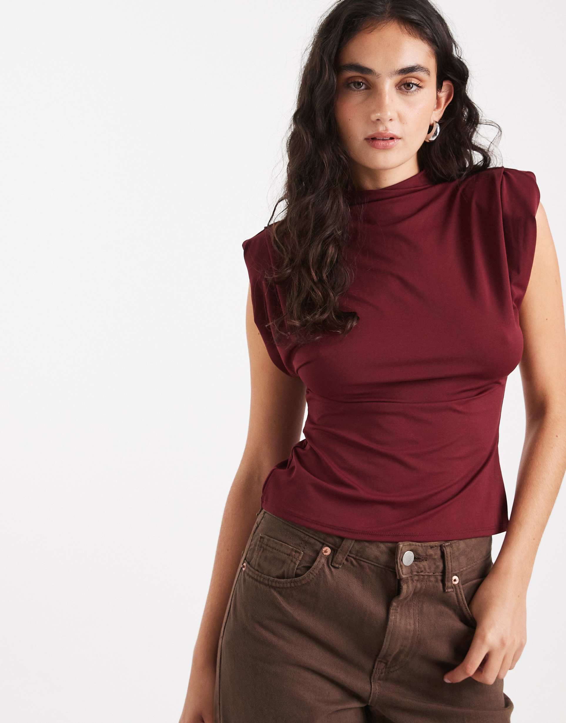 ASOS DESIGN SOFT HIGH NECK TOP WITH SHOULDER PADS IN BURGUNDY