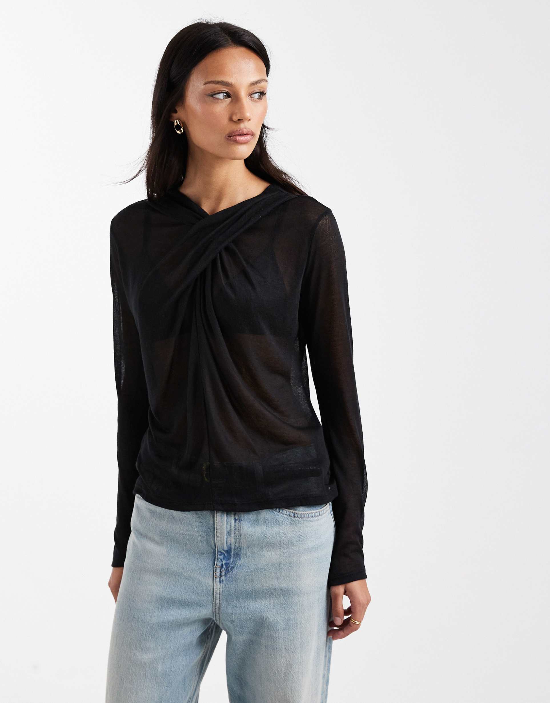 ASOS DESIGN SOFT SEMI SHEER DRAPE NECK LONG SLEEVE TOP IN BLACK