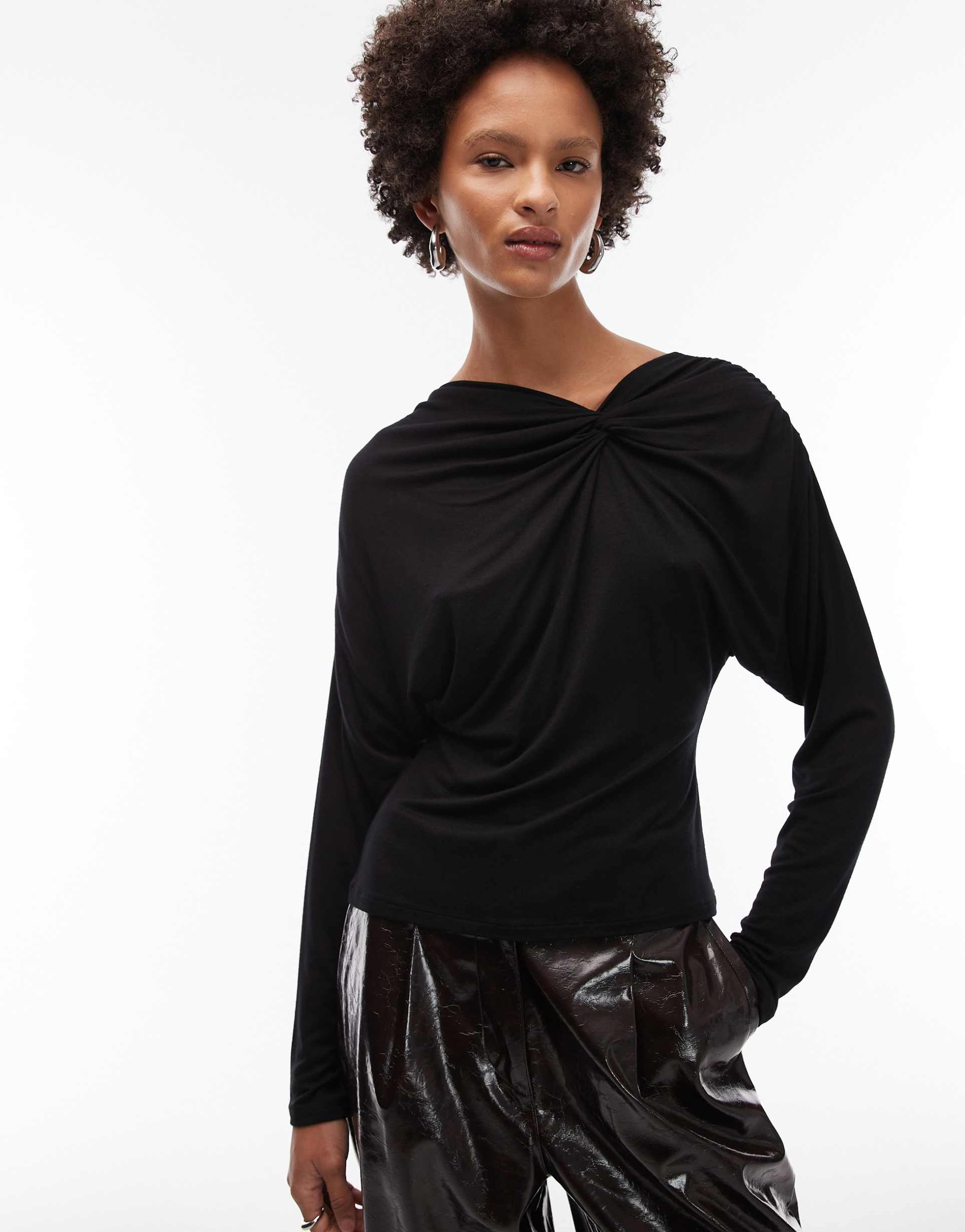 ASOS DESIGN SOFT TWISTED SHOULDER LONG SLEEVE TOP IN BLACK
