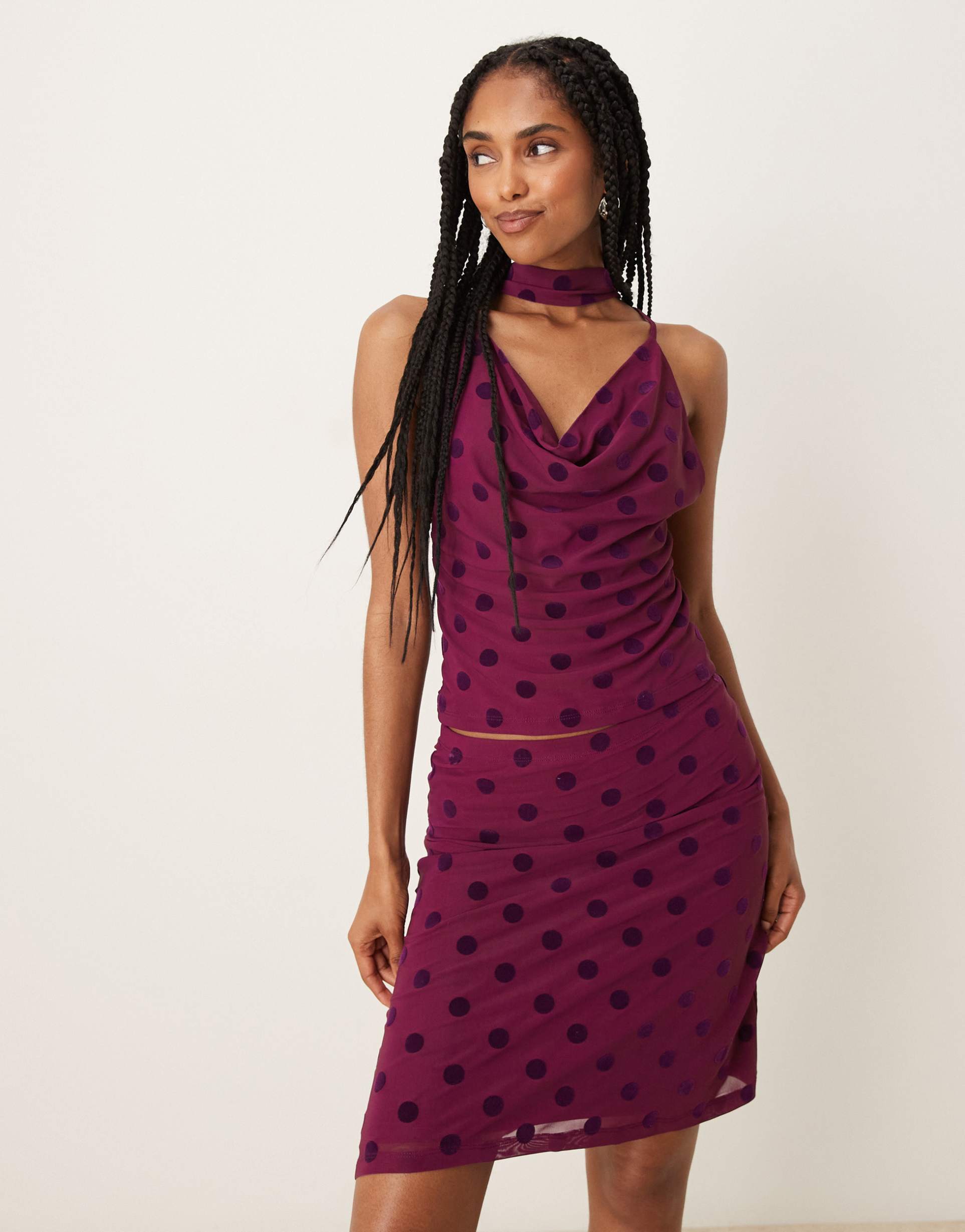 ASOS DESIGN SPOT FLOCKED MESH COWL NECK PLUNGE TOP WITH SCARF DETAIL IN PLUM - PART OF A SET