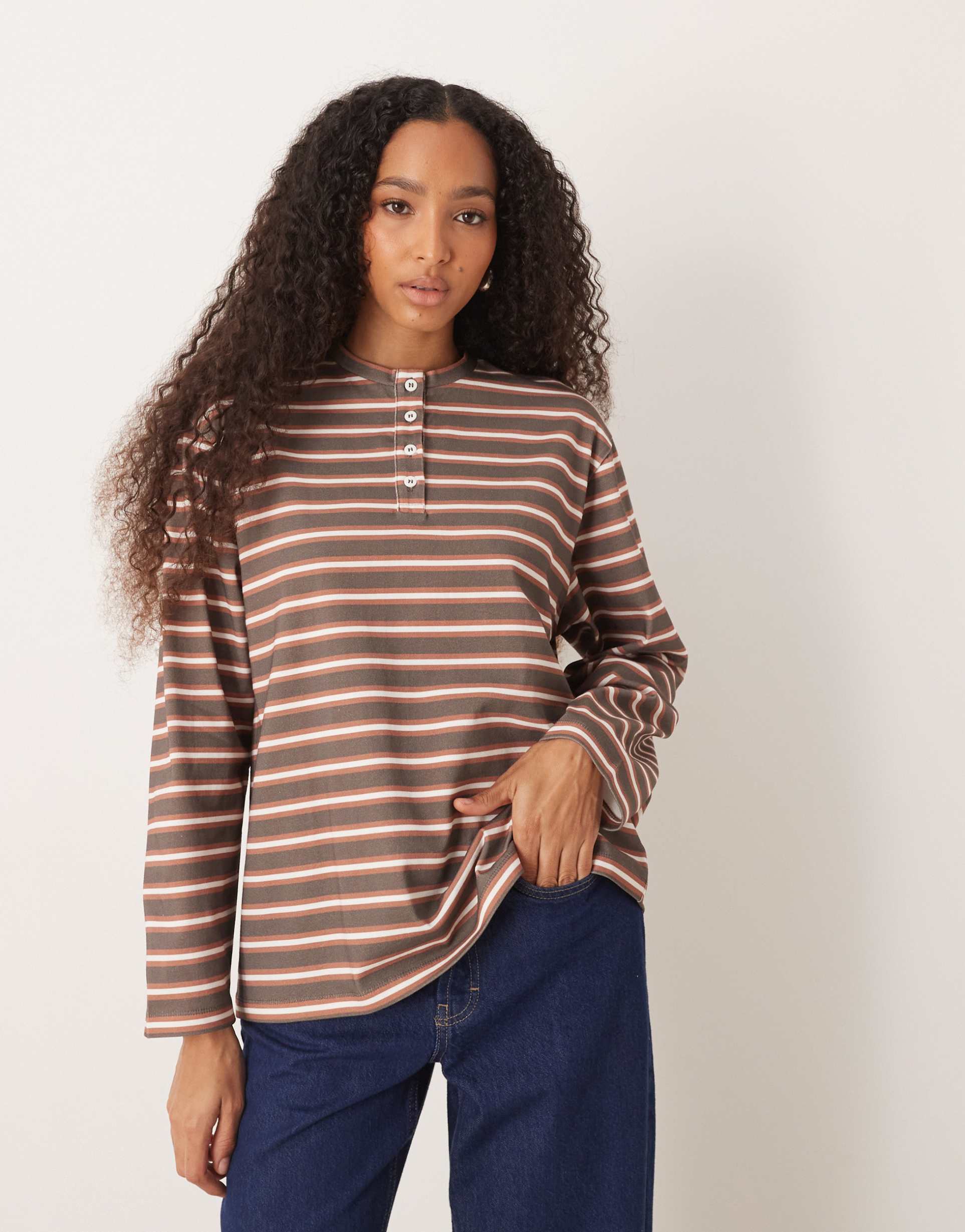 Soft, stretchy cotton jersey meets a relaxed, regular fit in this oversized henley top. Featuring a classic crew neck with a partial button placket and long sleeves, its brown and white stripes create a minimalist yet casual chic vibe. The hip-length hem ensures easy layering for cooler seasons like autumn and winter. Ideal for casual outings, everyday wear, or cozy loungewear moments, this striped top blends comfort with effortless style, making it a versatile addition to any wardrobe.