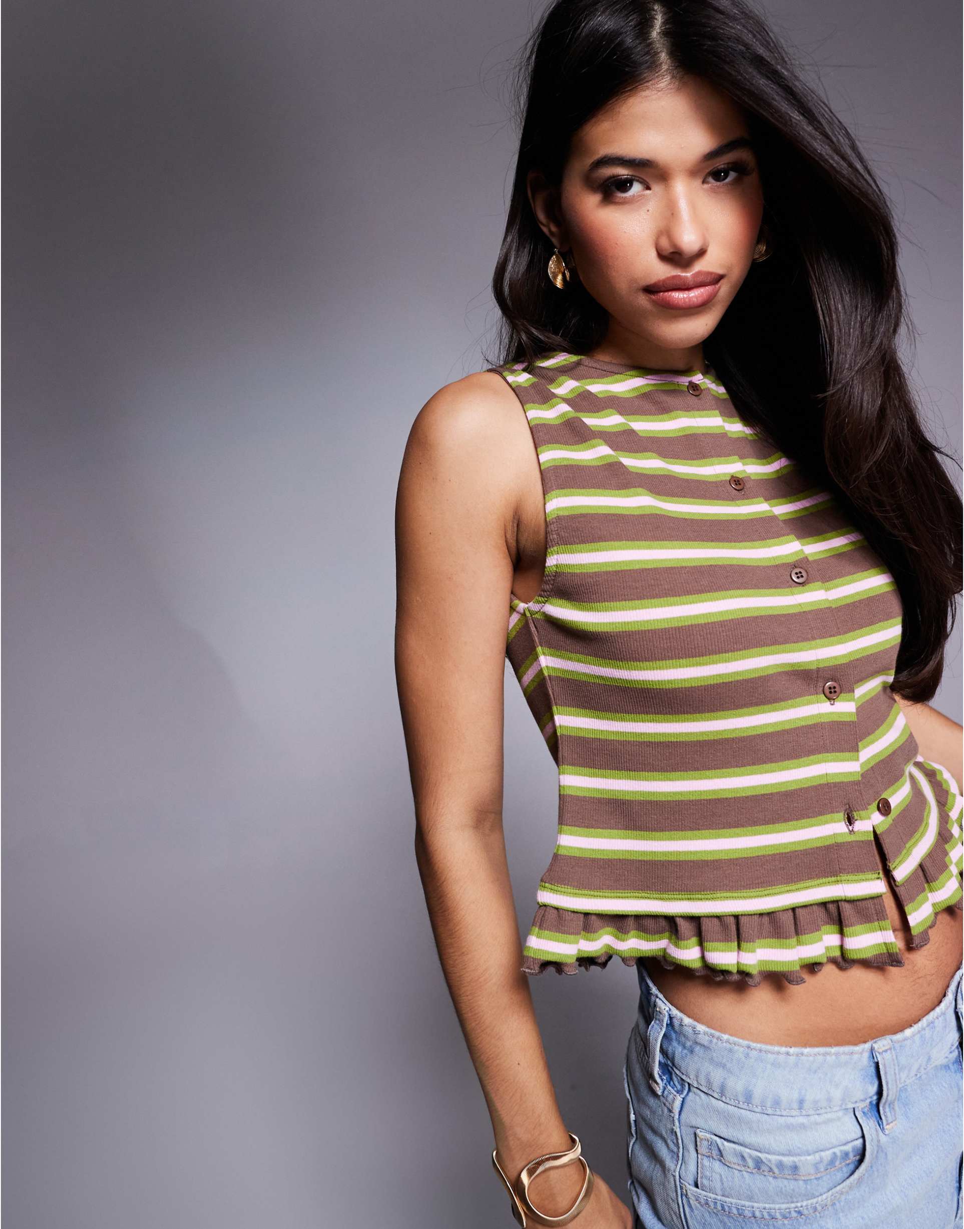 Top by ASOS DESIGNStripe designRound neckSleeveless styleButton-up frontRuffle hemBoxy fitProduct Code: 147197555Jersey: soft and stretchy knitted fabric Main: 95% Cotton, 5% Elastane.
