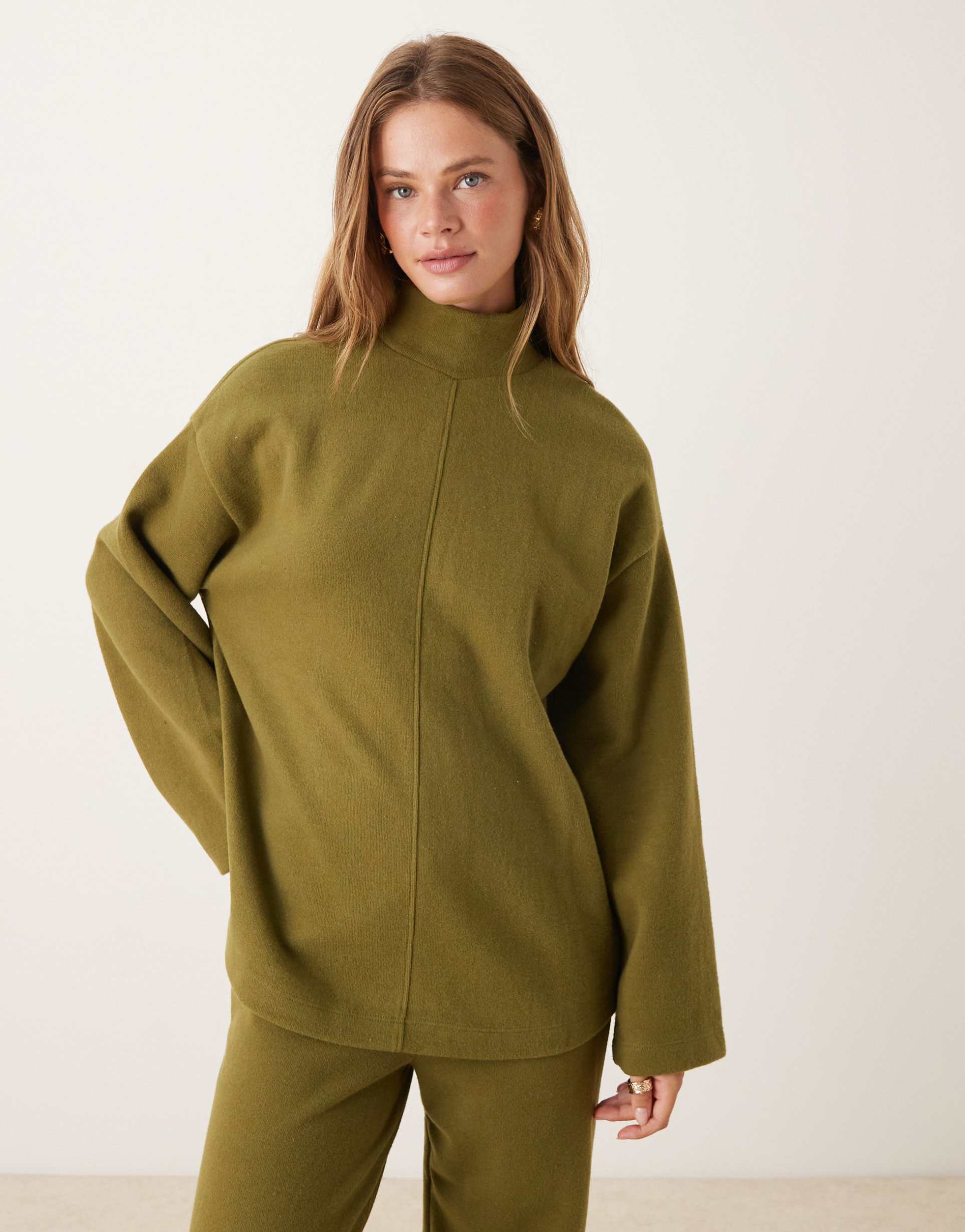 ASOS DESIGN SUPERSOFT SEAM FRONT LONGLINE TURTLE NECK TOP IN KHAKI GREEN - PART OF A SET