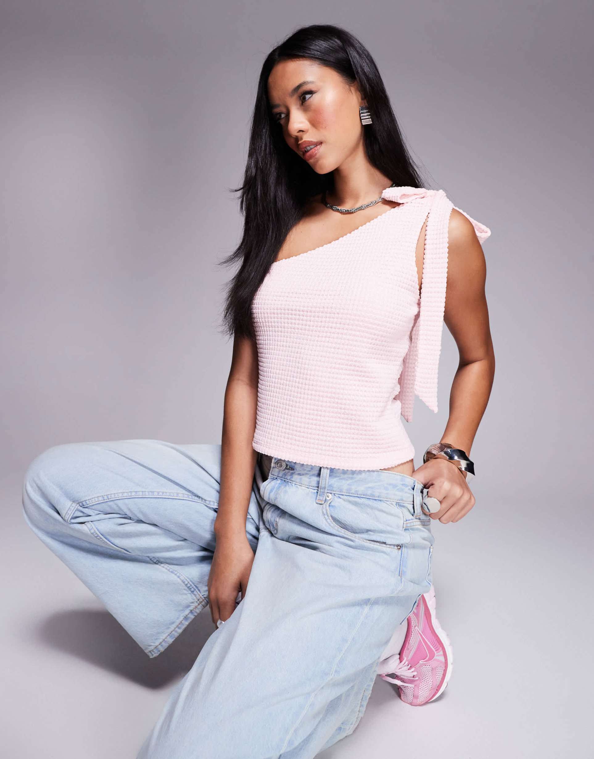 ASOS DESIGN TEXTURED ONE SHOULDER BOW TOP IN BABY PINK