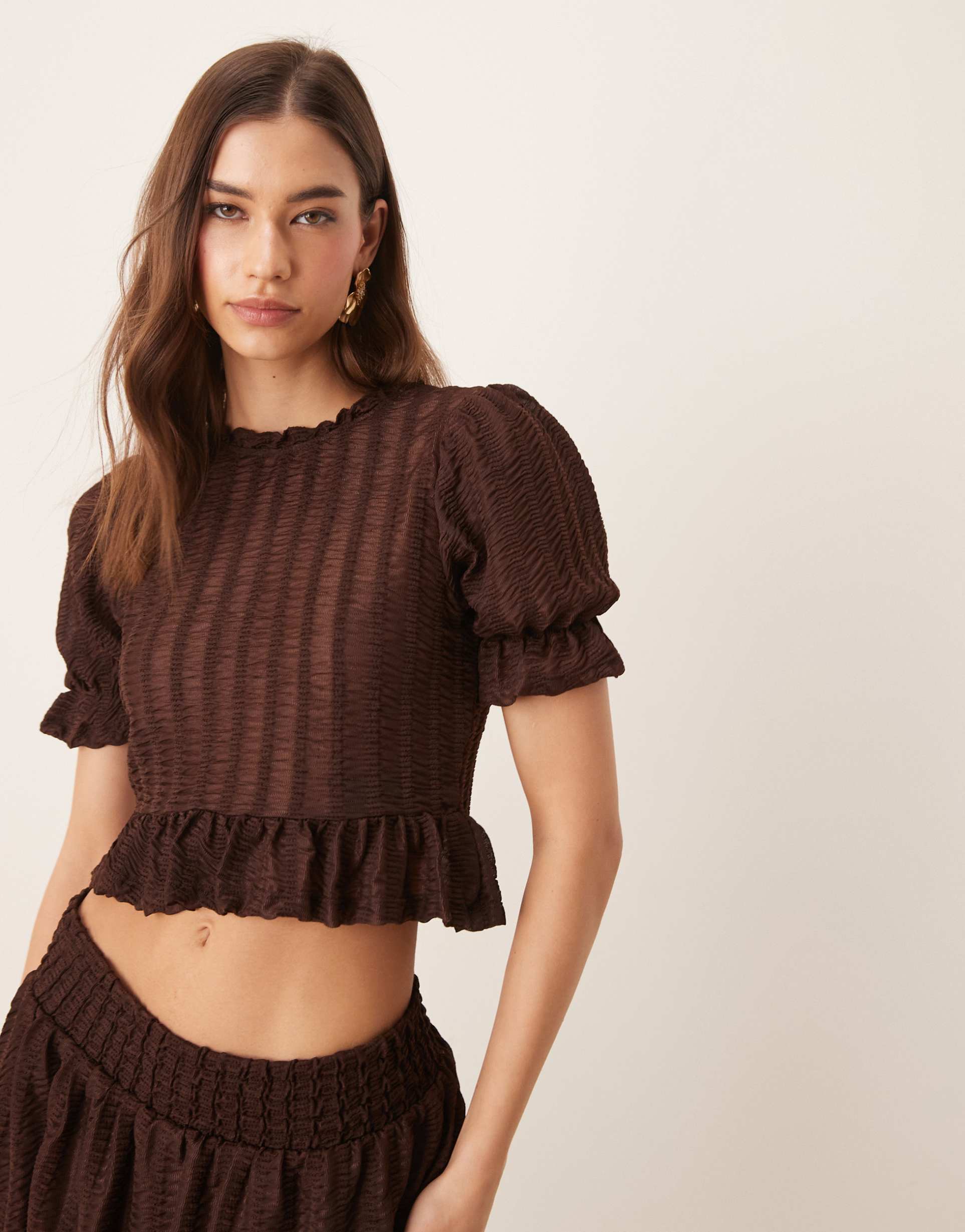 Textured matte brown cropped top with a high neckline and charming puffed half sleeves, featuring delicate ruffle detailing at the hem and sleeve cuffs. Crafted from a soft, stretchy polyester-elastane blend jersey fabric, this regular fit top offers comfort and modern casual chic style. Perfect for spring, summer, and autumn days, it suits casual outings, brunch dates, and everyday wear with ease and elegance.