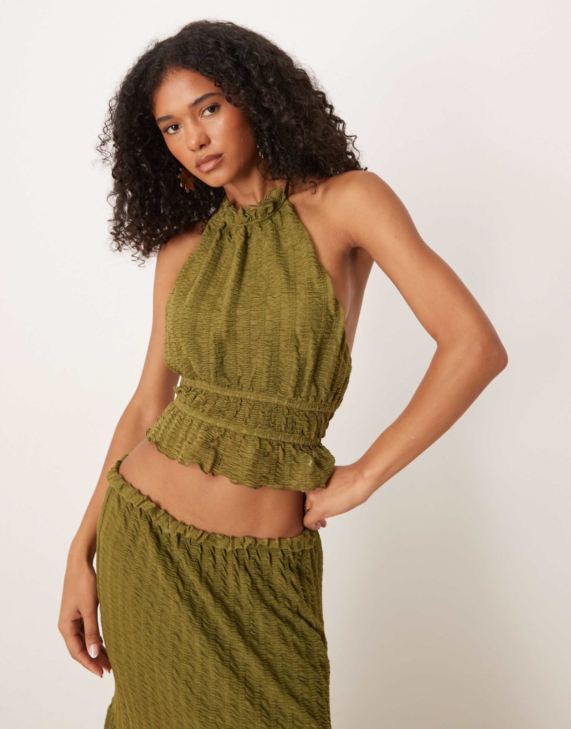 ASOS DESIGN TEXTURED SLEEVELESS HALTER NECK TOP WITH OPEN BACK IN GREEN - PART OF A SET