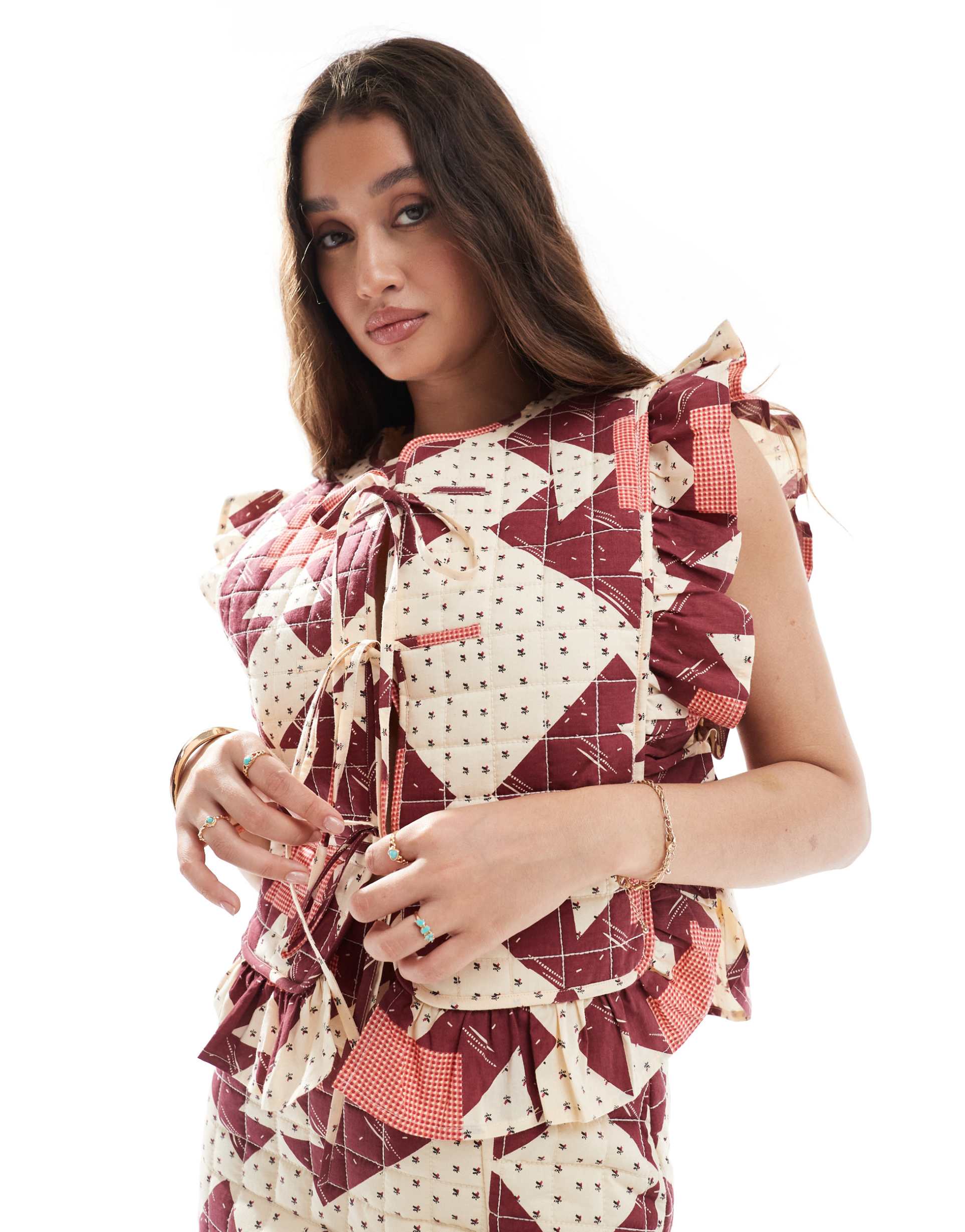 Soft quilted cotton fabric and a regular fit define this sleeveless shell top with a round neckline and ruffled sleeves. The geometric and polka dot print in cream and burgundy hues adds a playful bohemian vibe, while the tie-up front detail enhances its casual chic appeal. Its hip length and lightweight breathable cotton make it ideal for spring and summer occasions like brunch, casual outings, or everyday wear. The ruffle trims and textured quilting bring subtle yet distinctive charm to your warm-weather wardrobe.