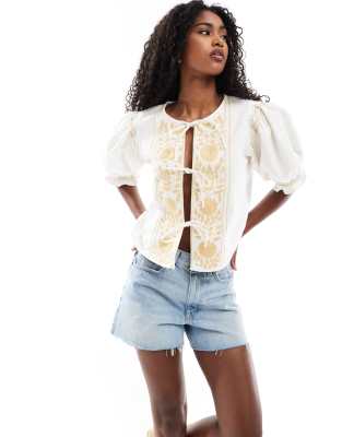 ASOS DESIGN TIE FRONT TOP WITH EMBROIDERY AND BRODERIE INSERTS