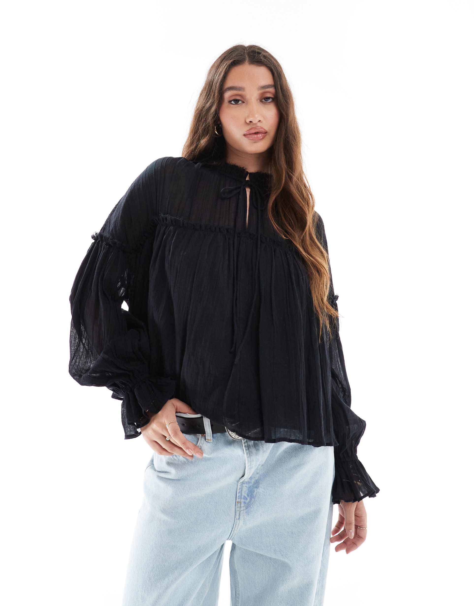 ASOS DESIGN TIE NECK RUFFLE DETAIL CRINKLE LONG SLEEVE SMOCK TOP IN BLACK