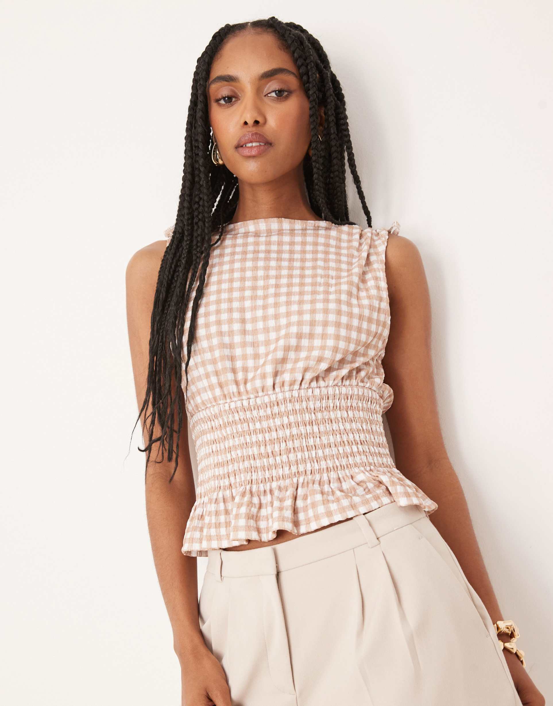 ASOS DESIGN TIE SHOULDER TOP WITH SHIRRED WAIST IN BROWN AND WHITE GINGHAM