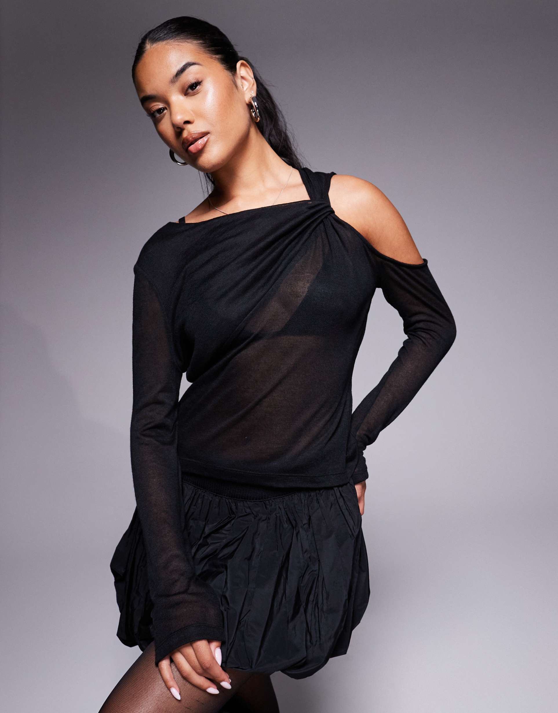 ASOS DESIGN TWIST SHOULDER SEMI SHEER LONG SLEEVE TOP IN BLACK