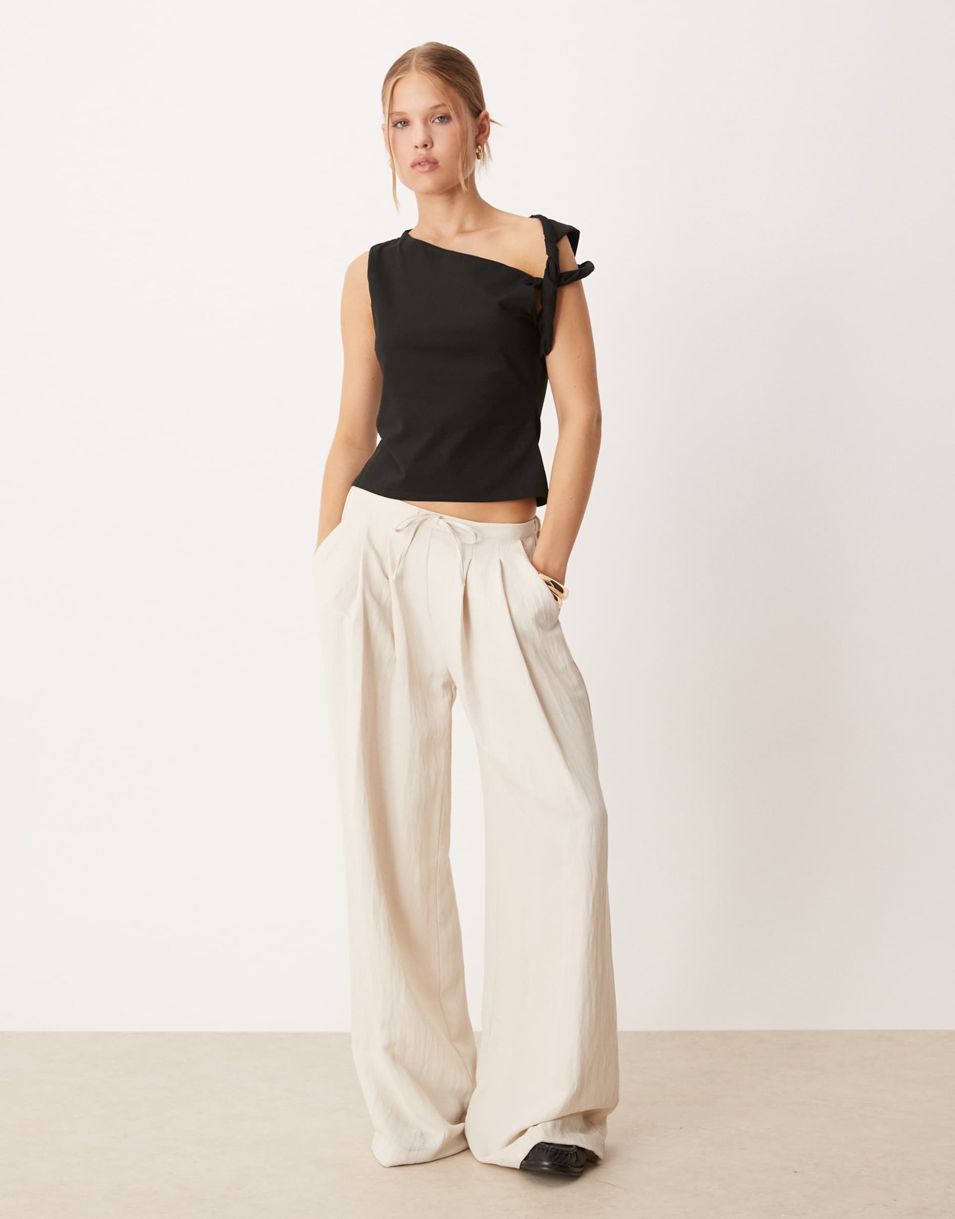 An effortlessly chic cropped top featuring a striking asymmetric neckline with a twist strap detail that adds a modern edge. Crafted from soft and stretchy black polyester jersey, this sleeveless piece offers a regular fit that enhances comfort and versatility. Ideal for spring and summer, it pairs perfectly with wide-leg trousers or skirts, making it suitable for casual outings, brunch dates, and relaxed evenings. The minimalist design combined with the unique shoulder twist detail delivers a sophisticated yet understated style essential for any contemporary wardrobe.