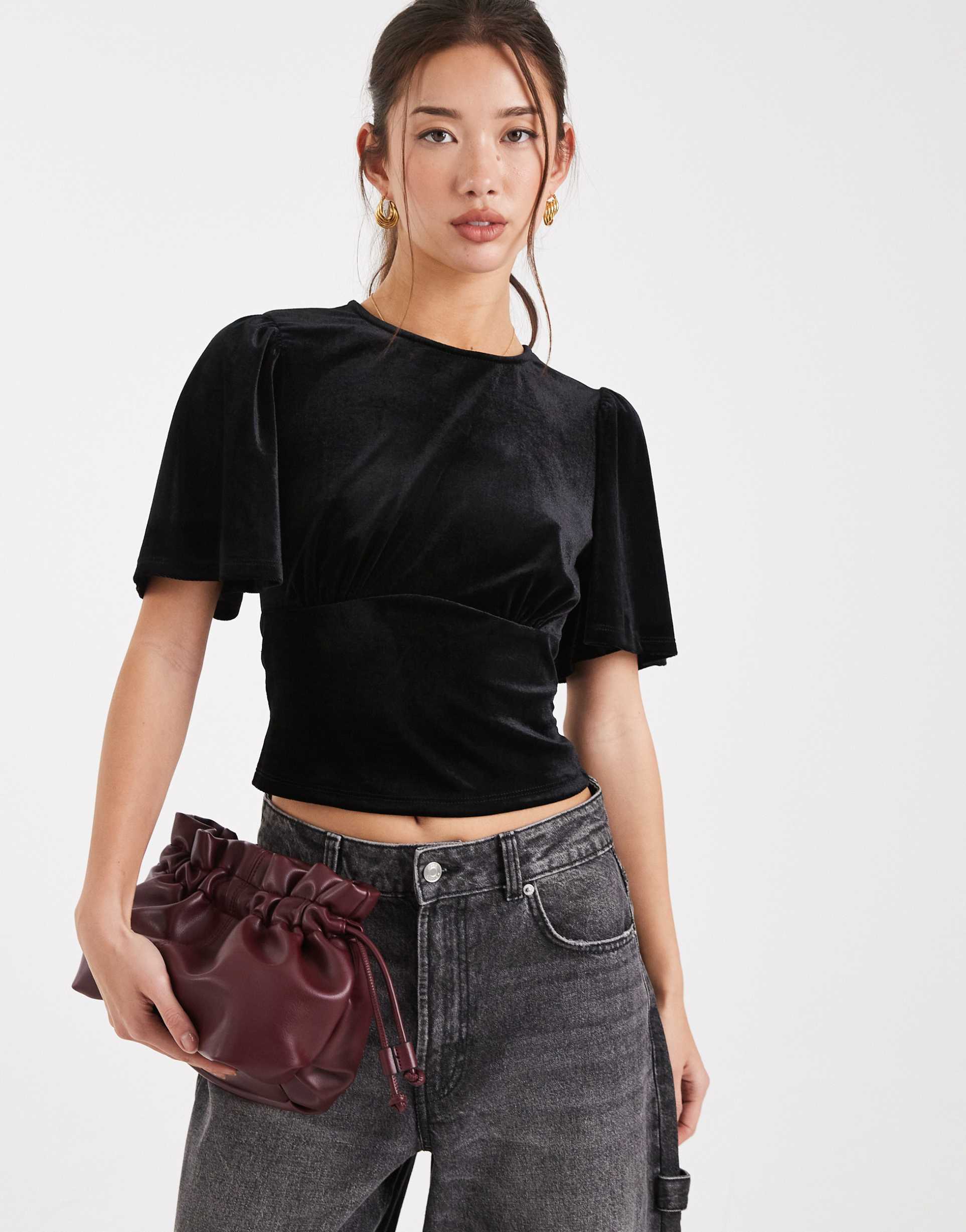 ASOS DESIGN VELVET PUFF SLEEVE TOP WITH TIE BACK IN BLACK