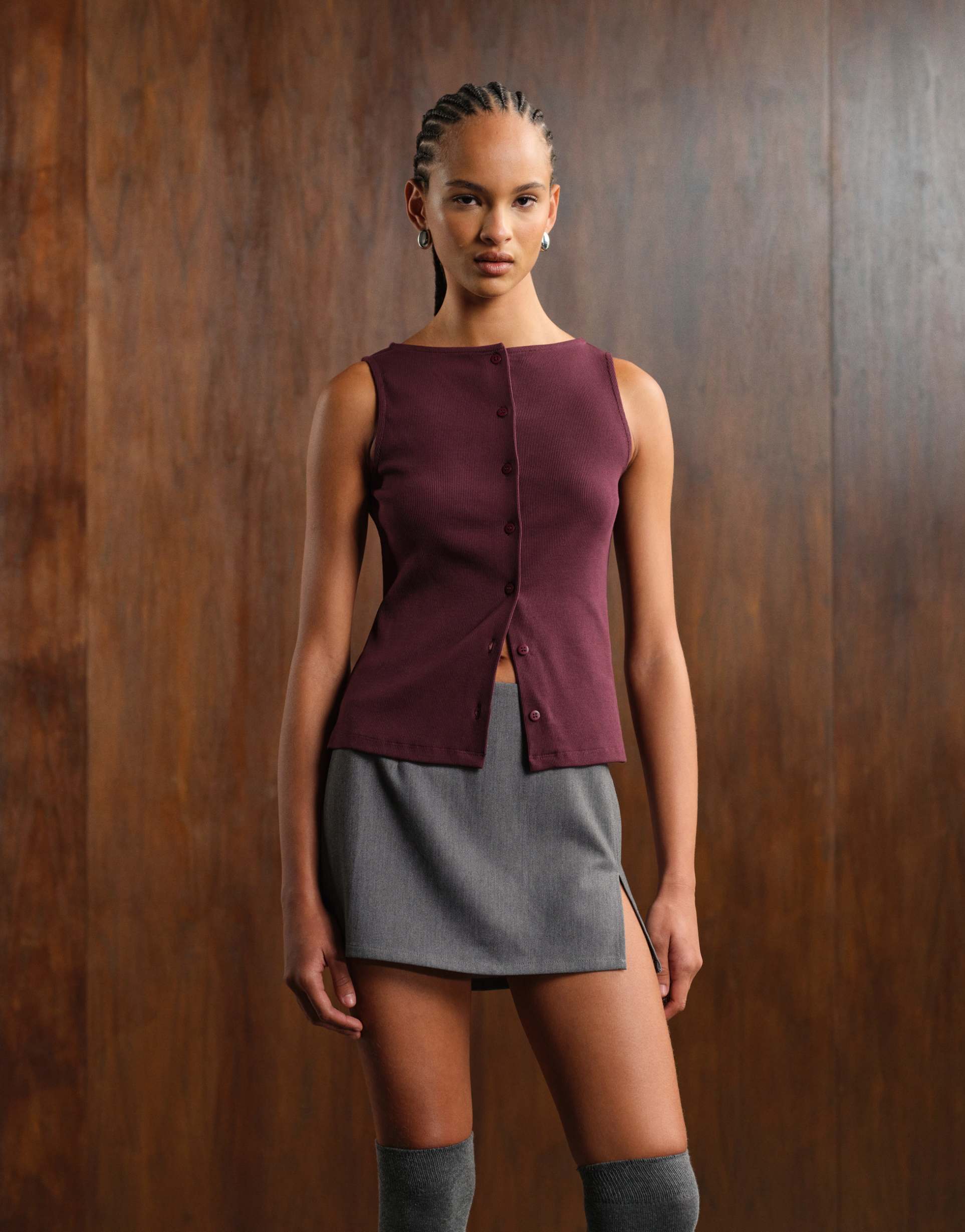 A sleek wide neck tank top in a rich matte dark red hue, crafted from soft, stretchy ribbed cotton jersey for a comfortable slim fit. Featuring a button-through front placket and sleeveless styling, this hip-length top offers minimalist appeal and versatile wearability. Perfect for casual outings, everyday wear, or brunch dates, it blends understated style with effortless comfort across spring, summer, and autumn seasons.